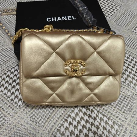 $289.00$279.00Replica 1:1 – Chanel 19 Flap Bag In Gold 25cm The Chanel 19 Flap Bag in Gold, measuring 25cm, exudes sophistication and contemporary charm. Its plush leather, adorned in a radiant gold tone, creates a luxurious statement piece. The iconic oversized diamond quilting, mixed metal chain, and bold CC clasp…