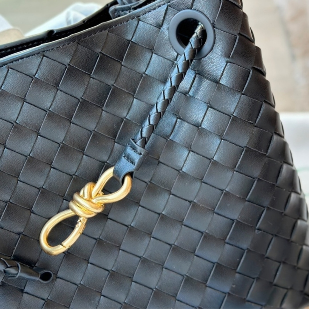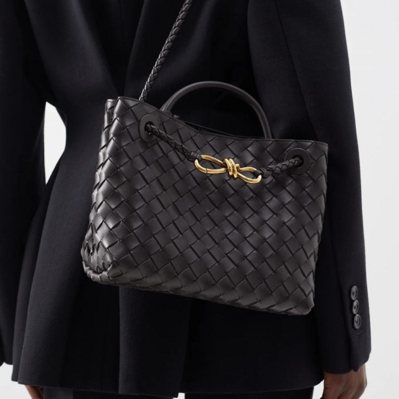 The Bottega Veneta Andiamo Bag in black showcases woven leather in a spacious, structured silhouette. Featuring a top handle and an adjustable shoulder strap, it’s designed for both elegance and versatility. The knotted metal detail adds a signature touch, making it a timeless piece for refined everyday use.