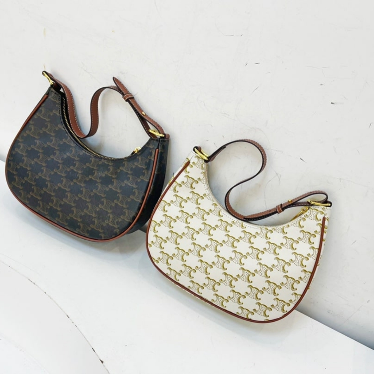 This is a Celine Ava Bag in canvas with the brand’s signature Triomphe monogram print. It features a crescent-shaped silhouette, smooth leather trim in brown, and a short adjustable strap for shoulder or hand carry. The design is chic and versatile, perfect for both casual and dressy occasions.