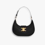 The bag showns with a distinctive crescent shape. It features a gold-tone Triomphe logo on the front flap, which serves as both a decorative element and a clasp. A single shoulder strap is attached to the bag with gold hardware, complementing the logo and completing its sleek design.