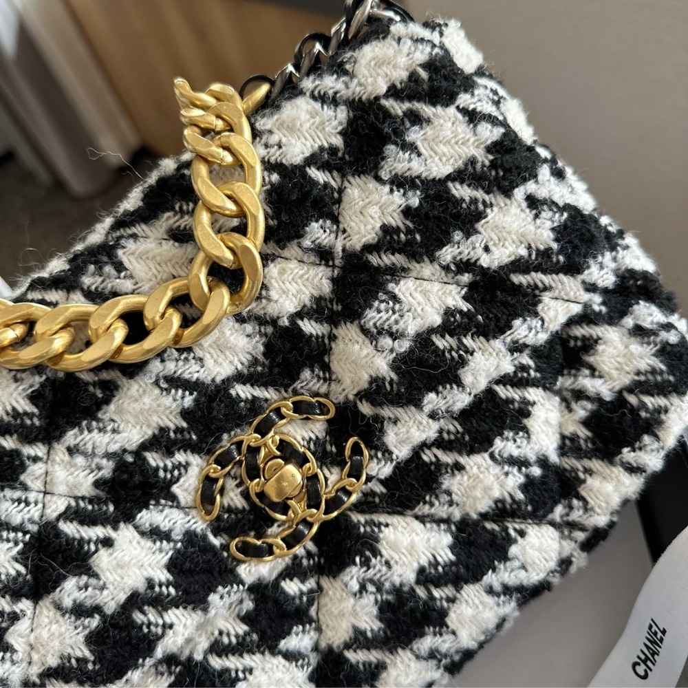 The Chanel 19 Bag in Tweed exudes a sophisticated and chic vibe. Its iconic quilted design, combined with the soft tweed texture, offers a timeless appeal. Perfect for adding a touch of elegance to any ensemble.