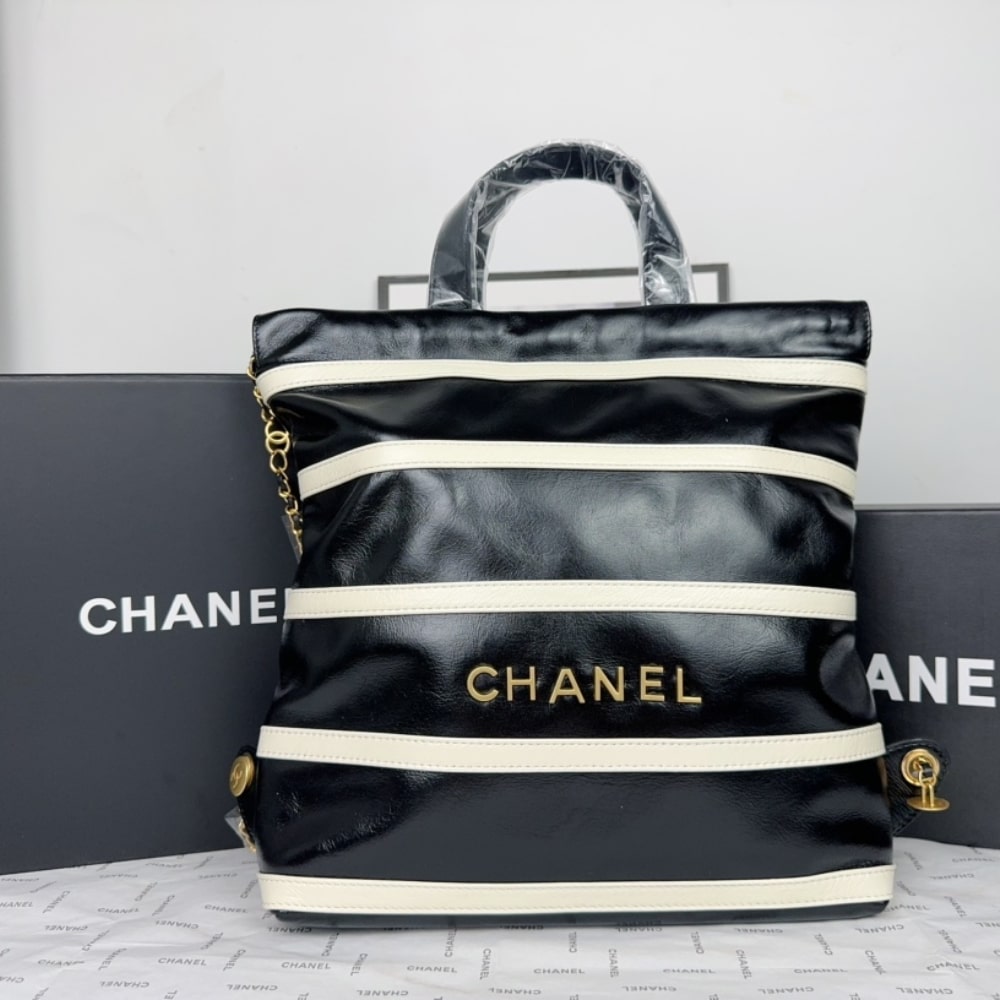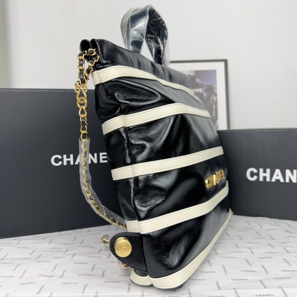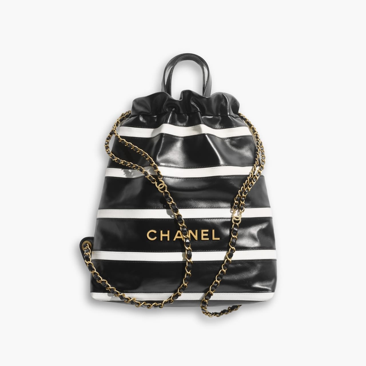 The Chanel 22 Backpack in Black and White combines practicality with high fashion. Crafted from shiny leather and adorned with gold-tone metal accents, this backpack features a spacious interior and adjustable straps, making it both functional and stylish for everyday use.
