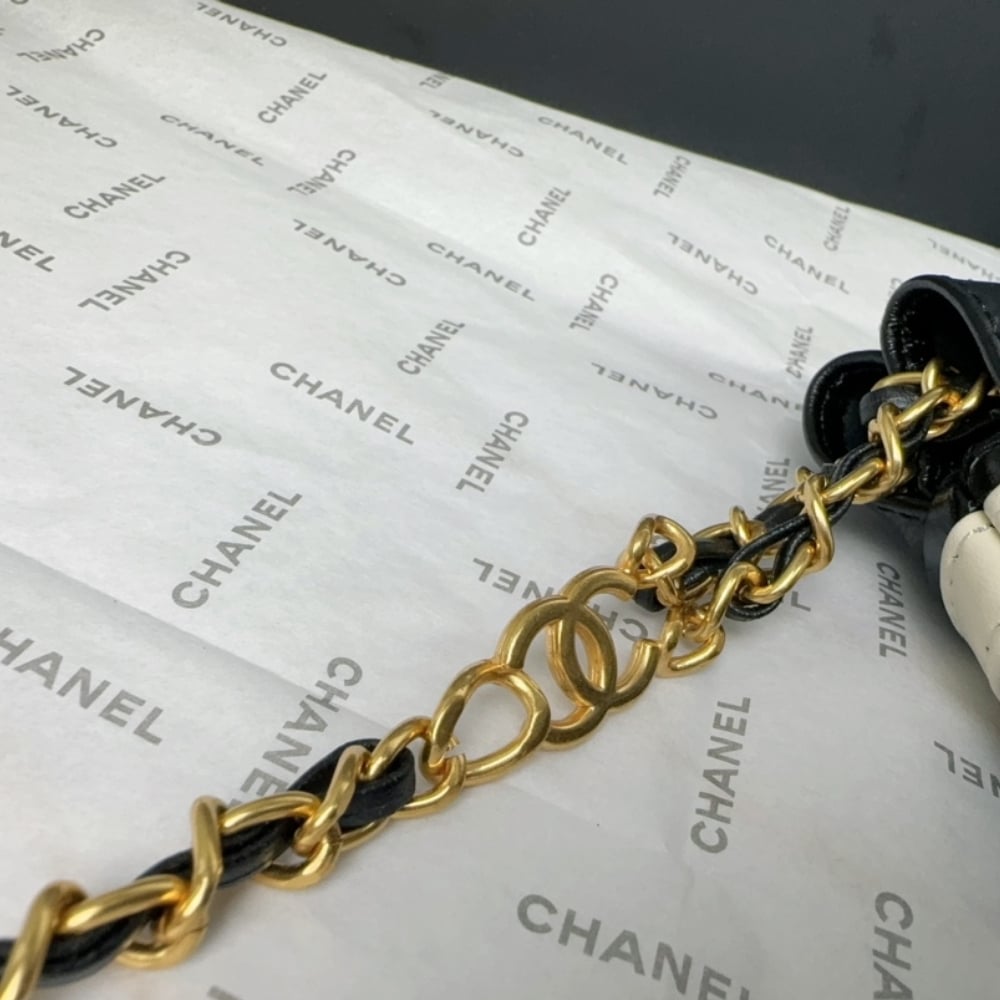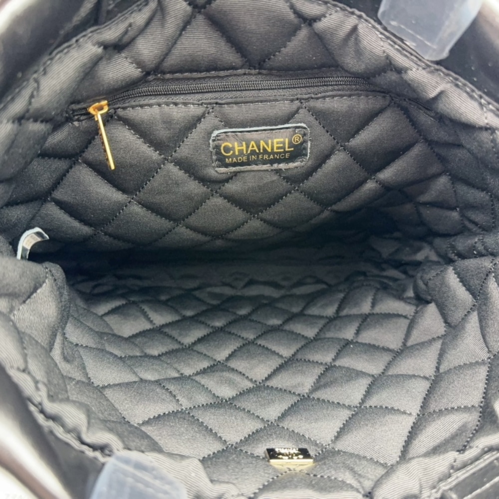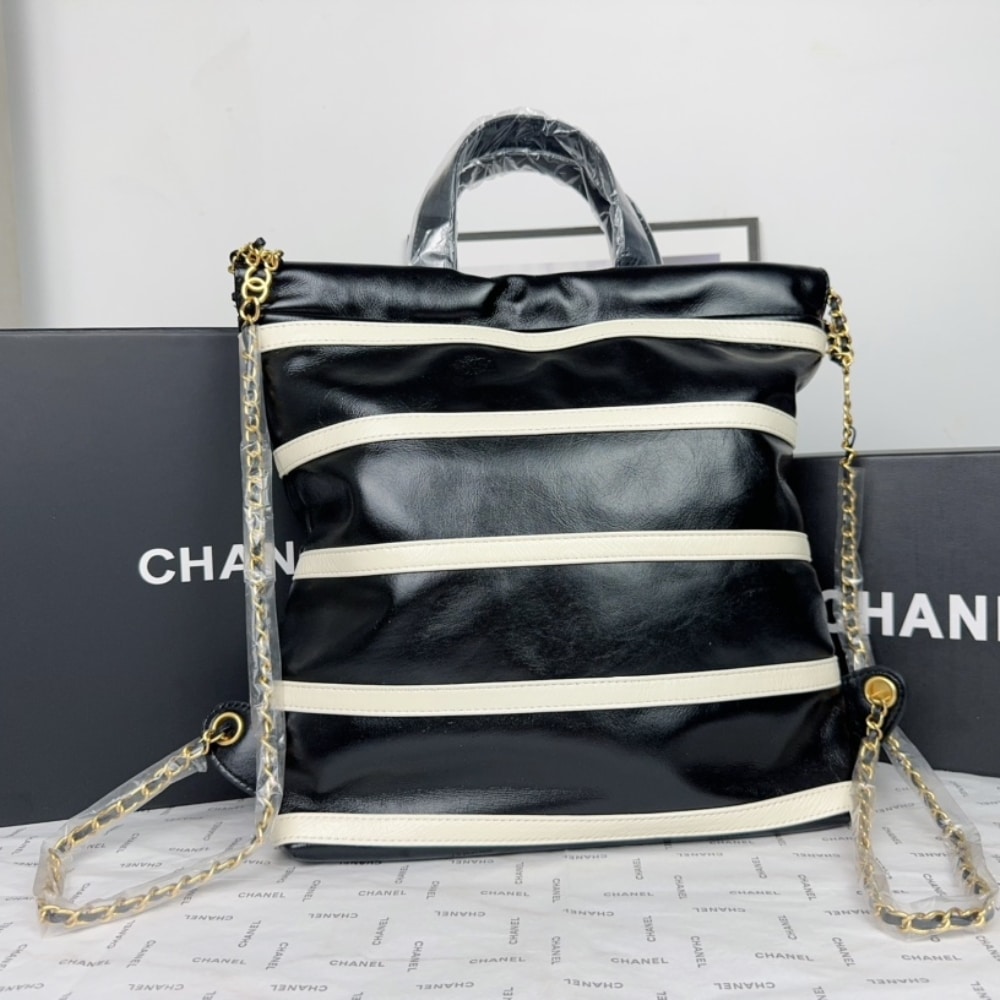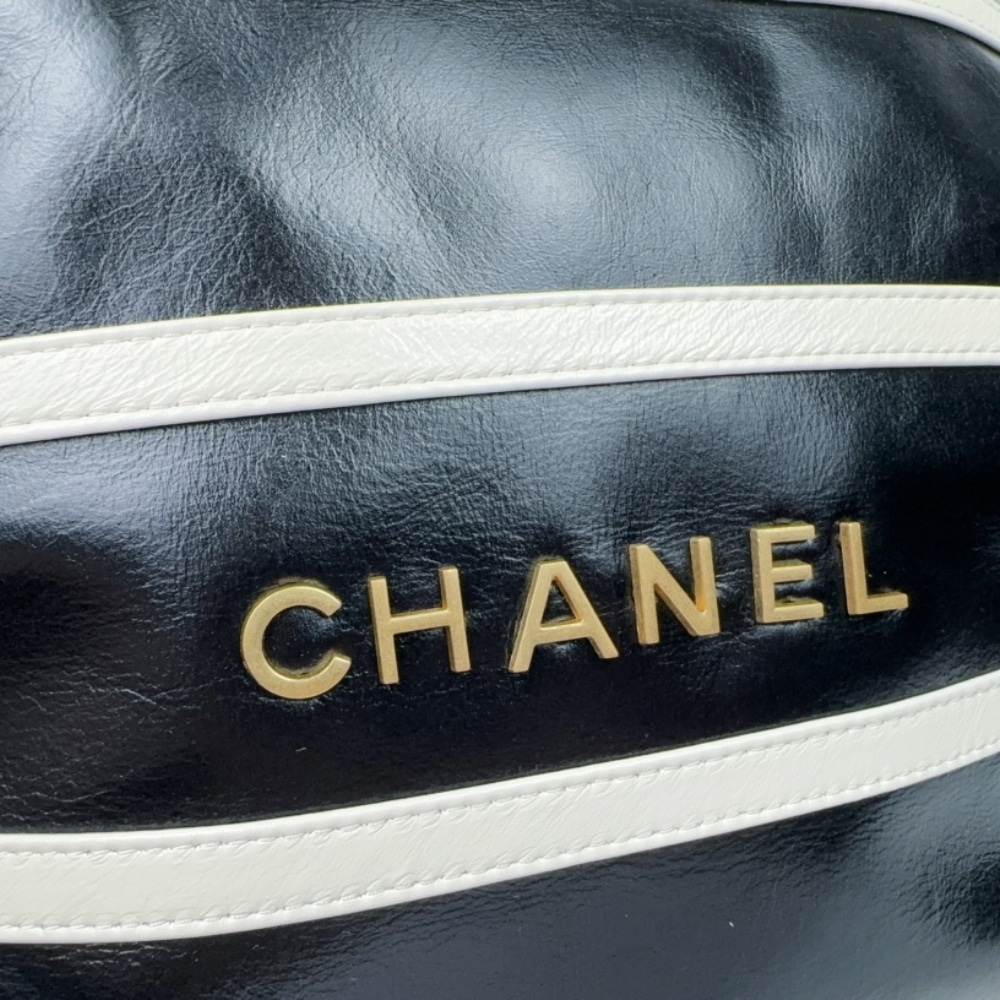 The Chanel 22 Backpack in Black and White combines practicality with high fashion. Crafted from shiny leather and adorned with gold-tone metal accents, this backpack features a spacious interior and adjustable straps, making it both functional and stylish for everyday use.