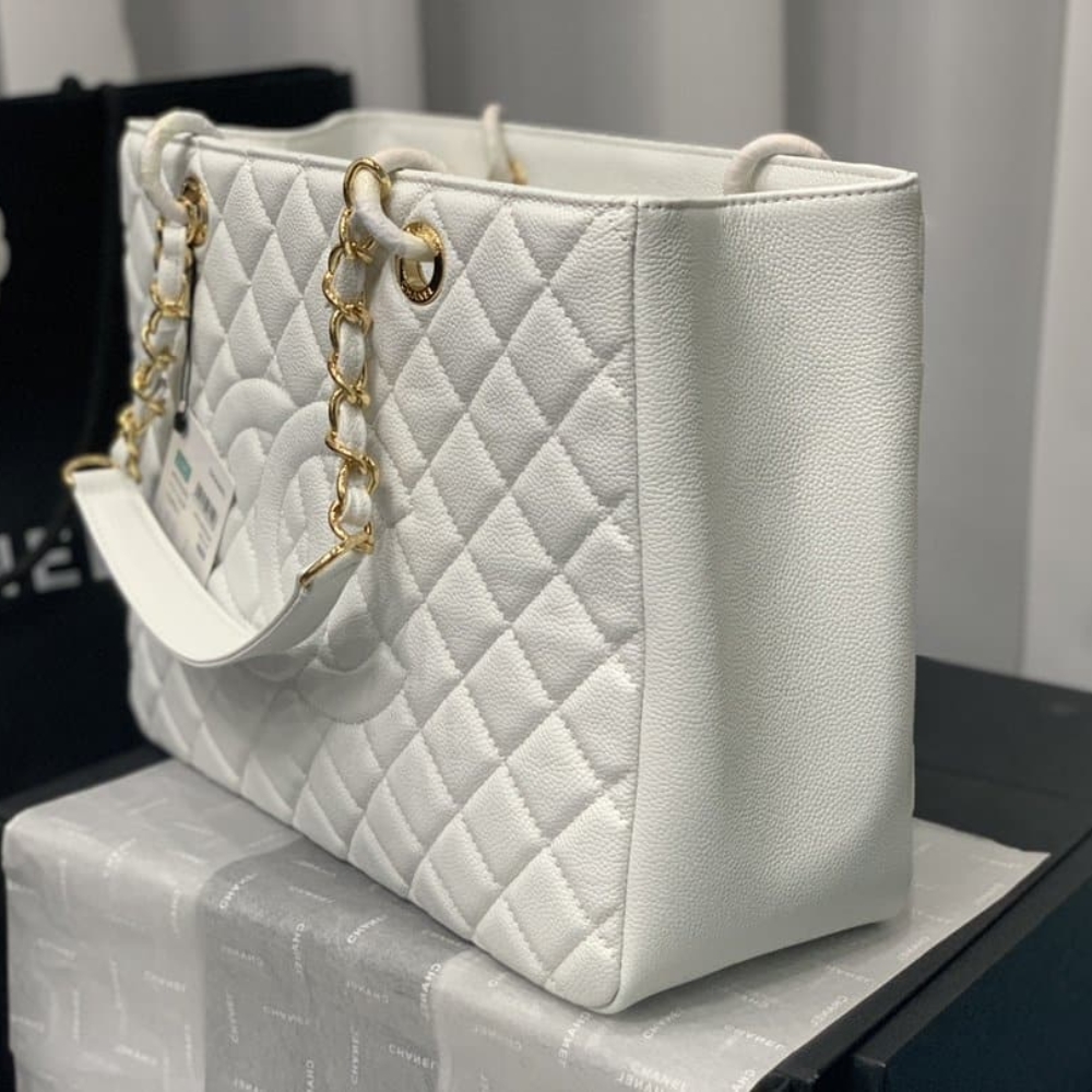 The Chanel Bolsa Grand Tote Bag in White combines timeless elegance with exceptional practicality. Its spacious design, signature quilted pattern, and iconic CC logo make it a perfect choice for sophisticated everyday use. A statement of effortless luxury.