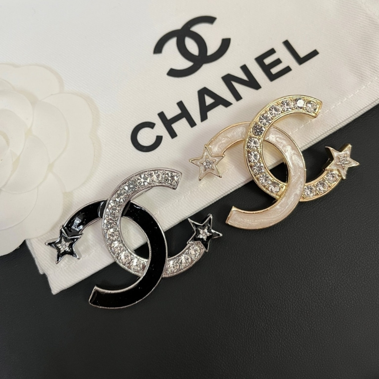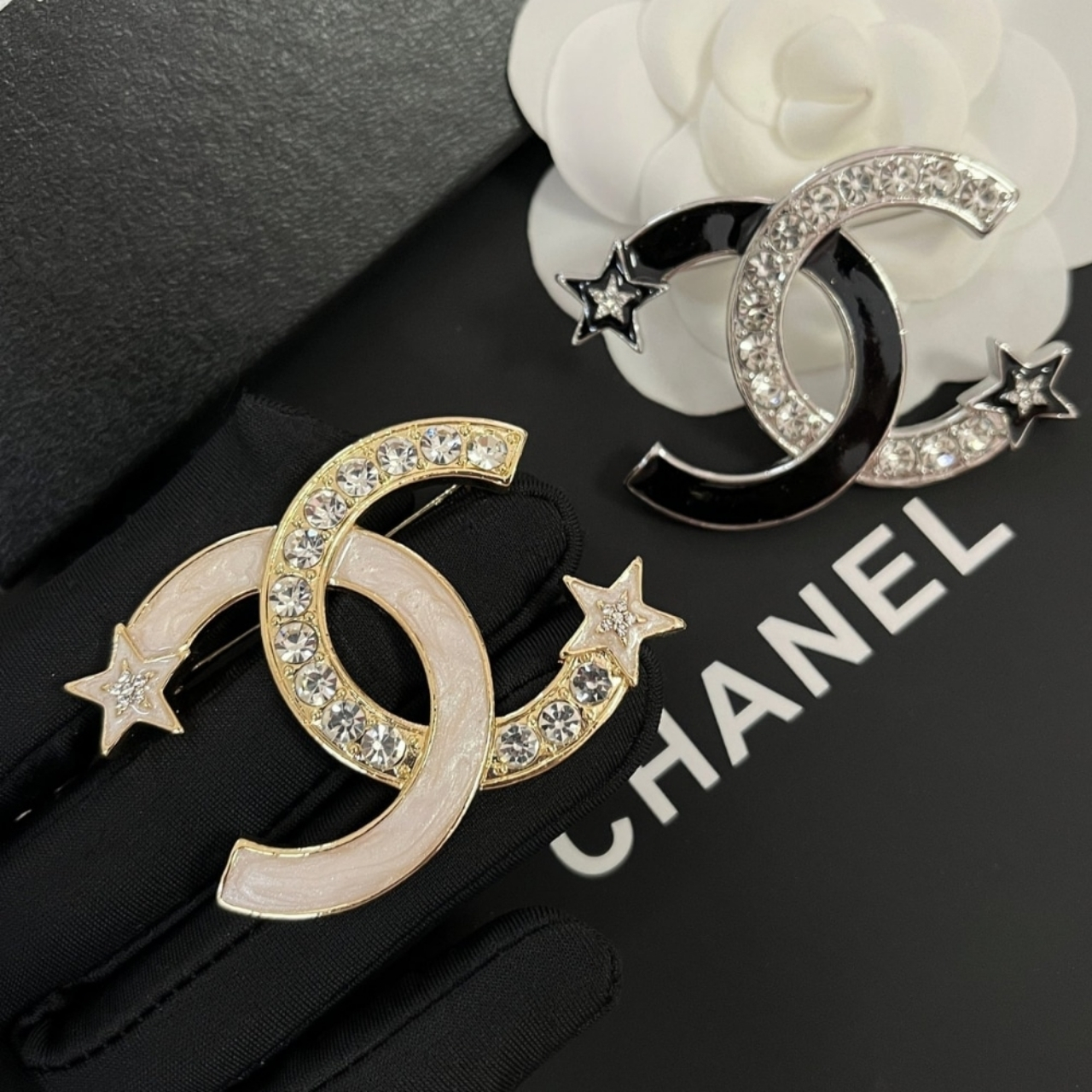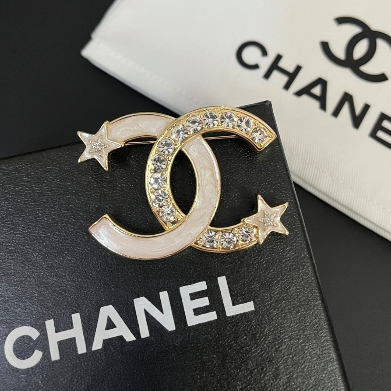 This brooch brilliantly captures the celestial theme of Chanel’s Comète collection, featuring a large, luminous white enamel/resin CC logo accented with a sparkling gold-tone “shooting star” trail of crystals. The sleek white surface provides a clean, modern backdrop that makes the dazzling, high-movement star motif truly pop, creating a piece that is both classic and wonderfully dynamic.