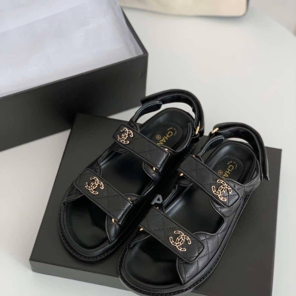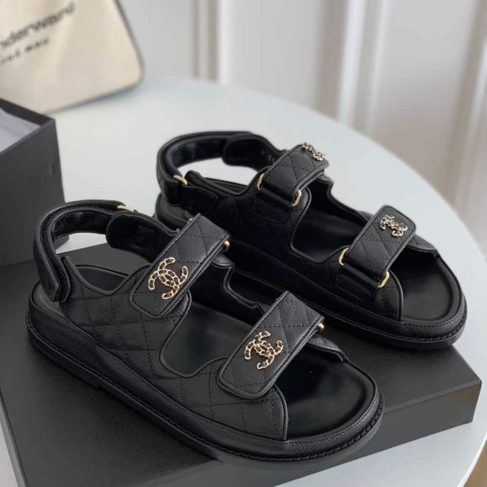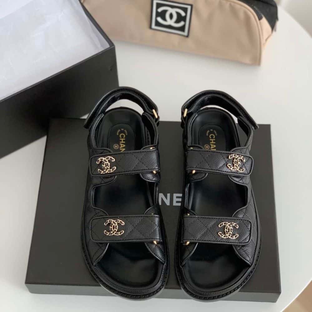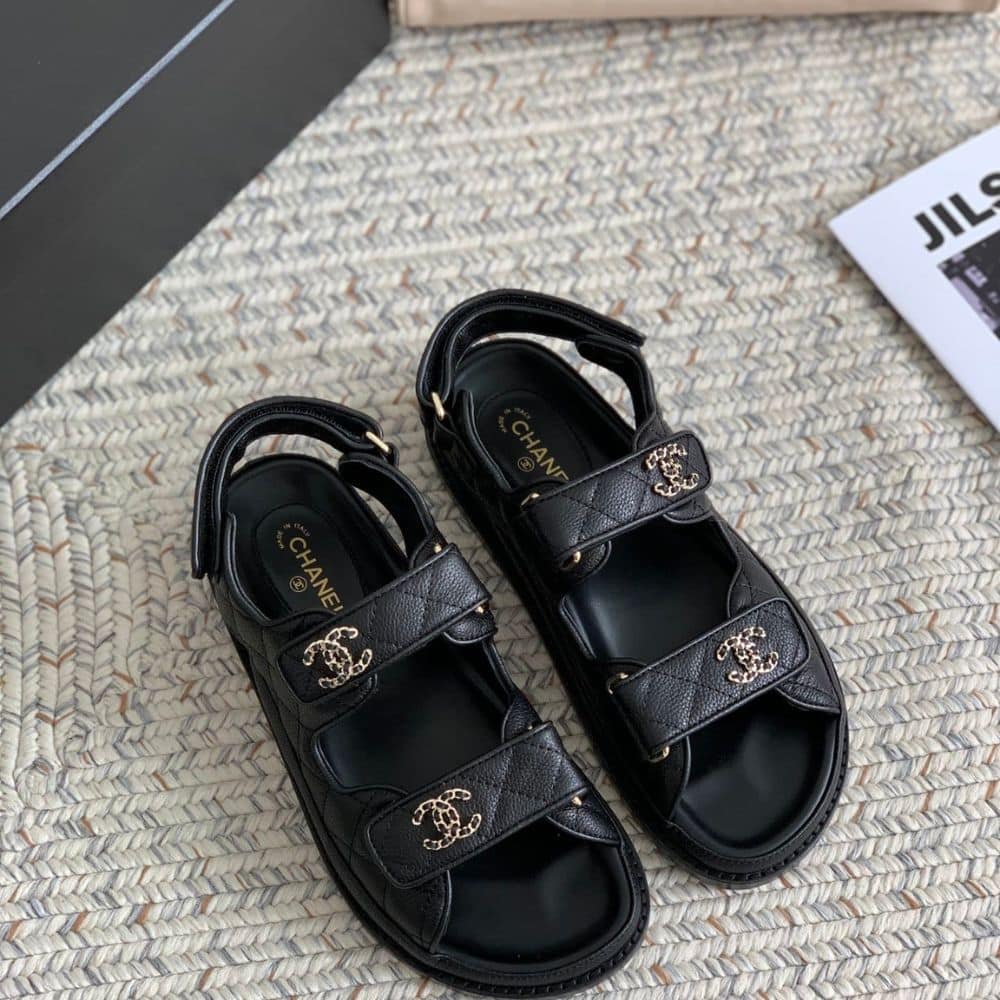 Replica 1:1 – Chanel CC Button Velcro Black Sandals Grained Leather