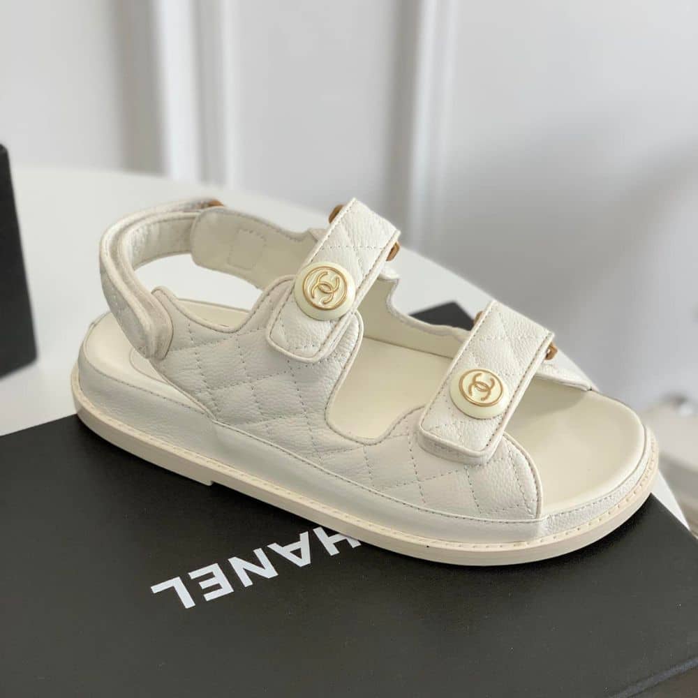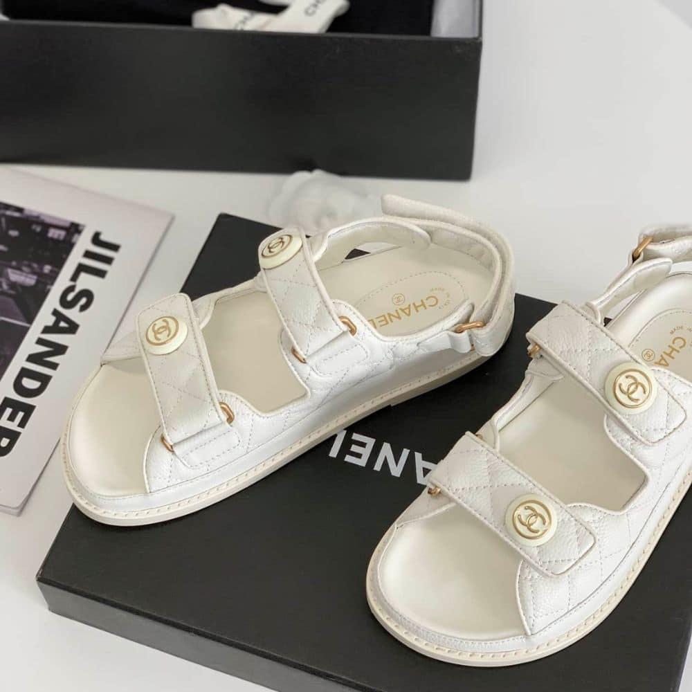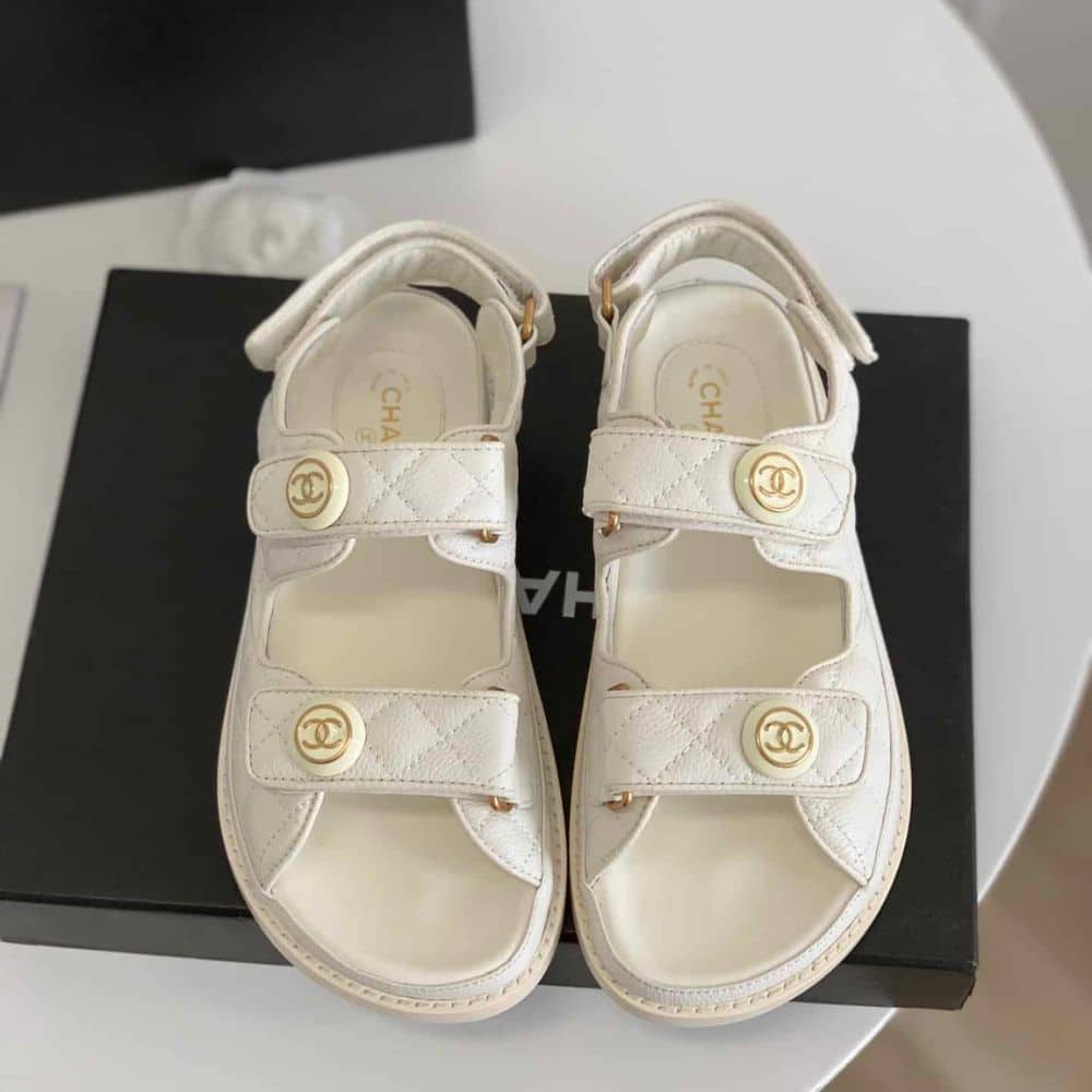 Replica 1:1 – Chanel CC Button Velcro White Sandals Grained Leather