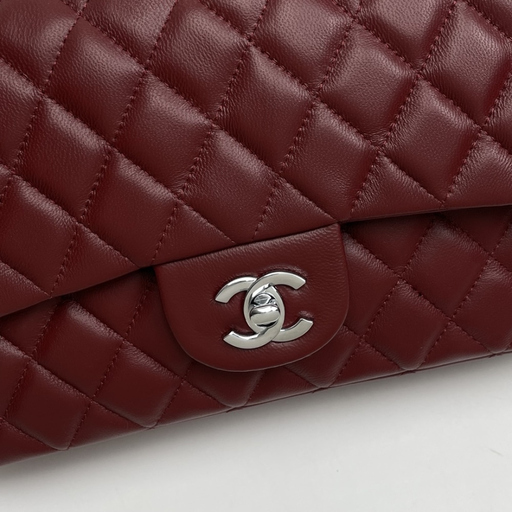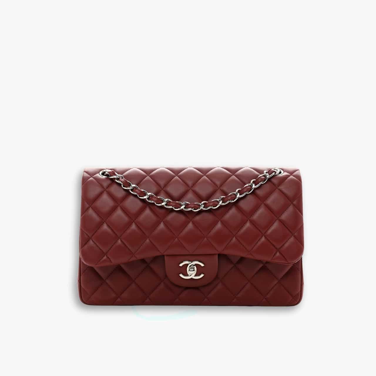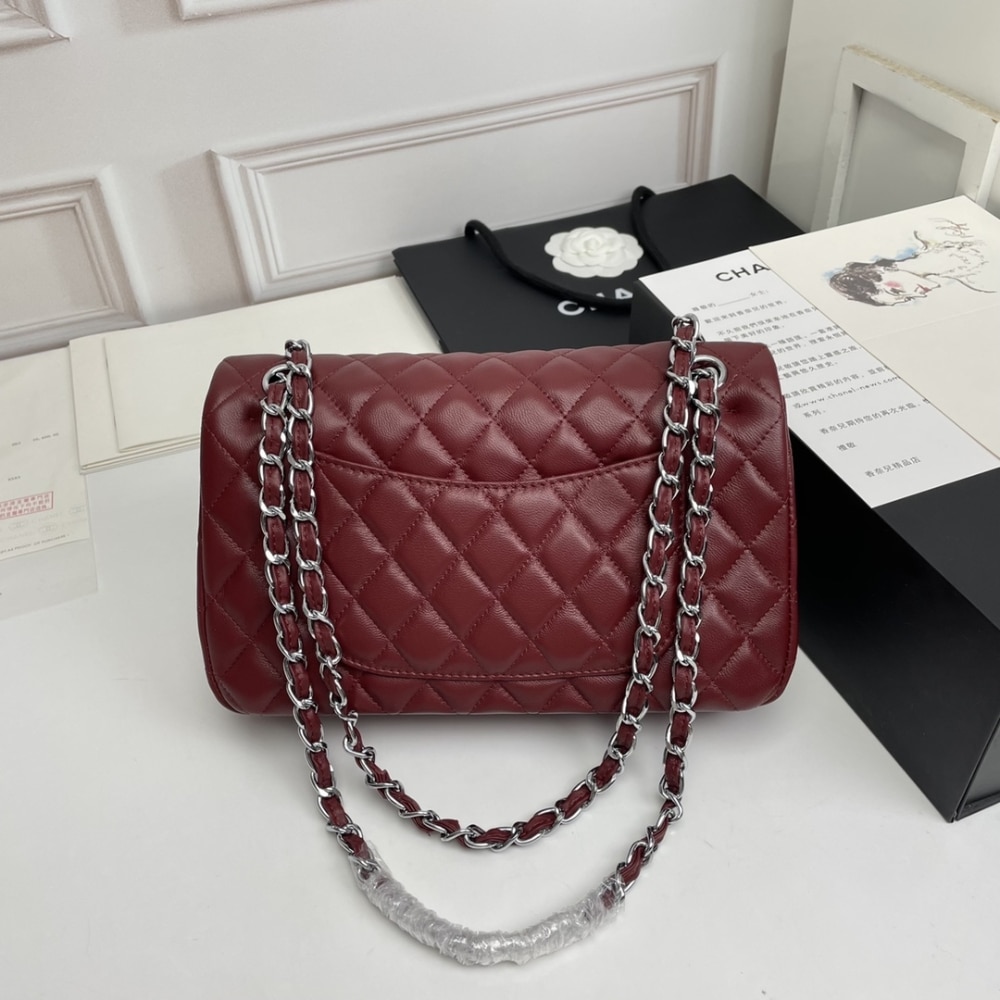 The Chanel Classic Bag in Leather & Silver Metal (Plum Red) exudes power and luxury. Its rich, deep red hue paired with soft leather and elegant silver-tone hardware creates a statement of bold sophistication. Perfect for the woman who commands attention.