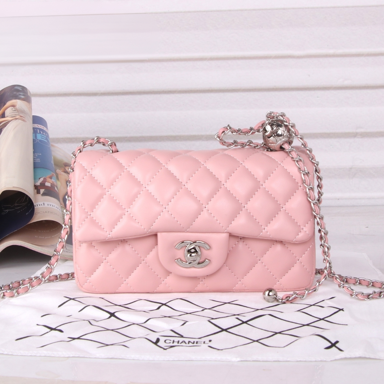This is a Chanel Classic Flap Bag in a soft pastel pink shade. It features the iconic silver-tone CC turn-lock closure, and a chain strap interwoven. The bag is a small yet stylish accessory perfect.