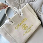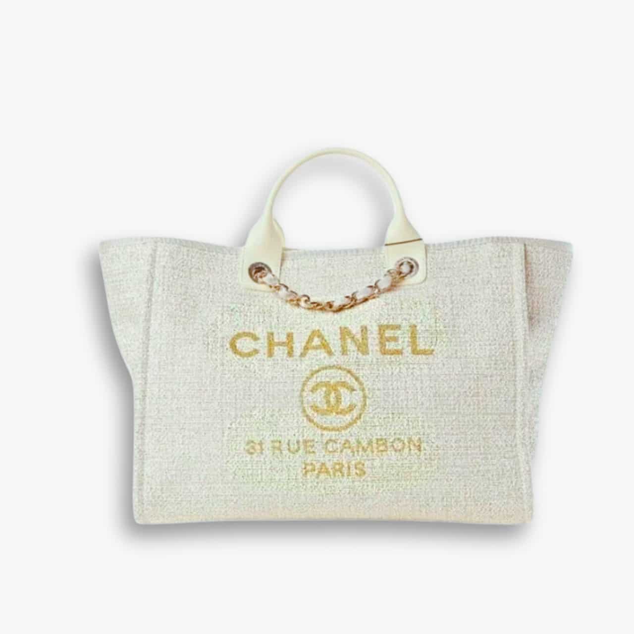 The Chanel Deauville tote bag is crafted from fabric featuring the iconic Chanel logo, offering a blend of elegance and sophistication. Lightweight and easy to carry over the shoulder, the bag provides comfort for the user. While many tote bags can appear too casual, the Chanel Deauville stands out with its stylish design, ensuring you always stay on trend.