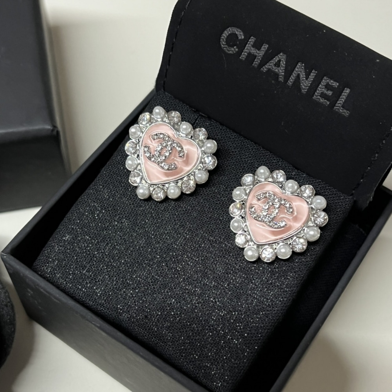 These Chanel heart-shaped earrings exude timeless romance and elegance. The glossy pink center adorned with the iconic CC logo is surrounded by delicate pearls and sparkling crystals, creating a look that’s both youthful and luxurious. Perfect for adding a touch of sophistication and charm to any outfit.