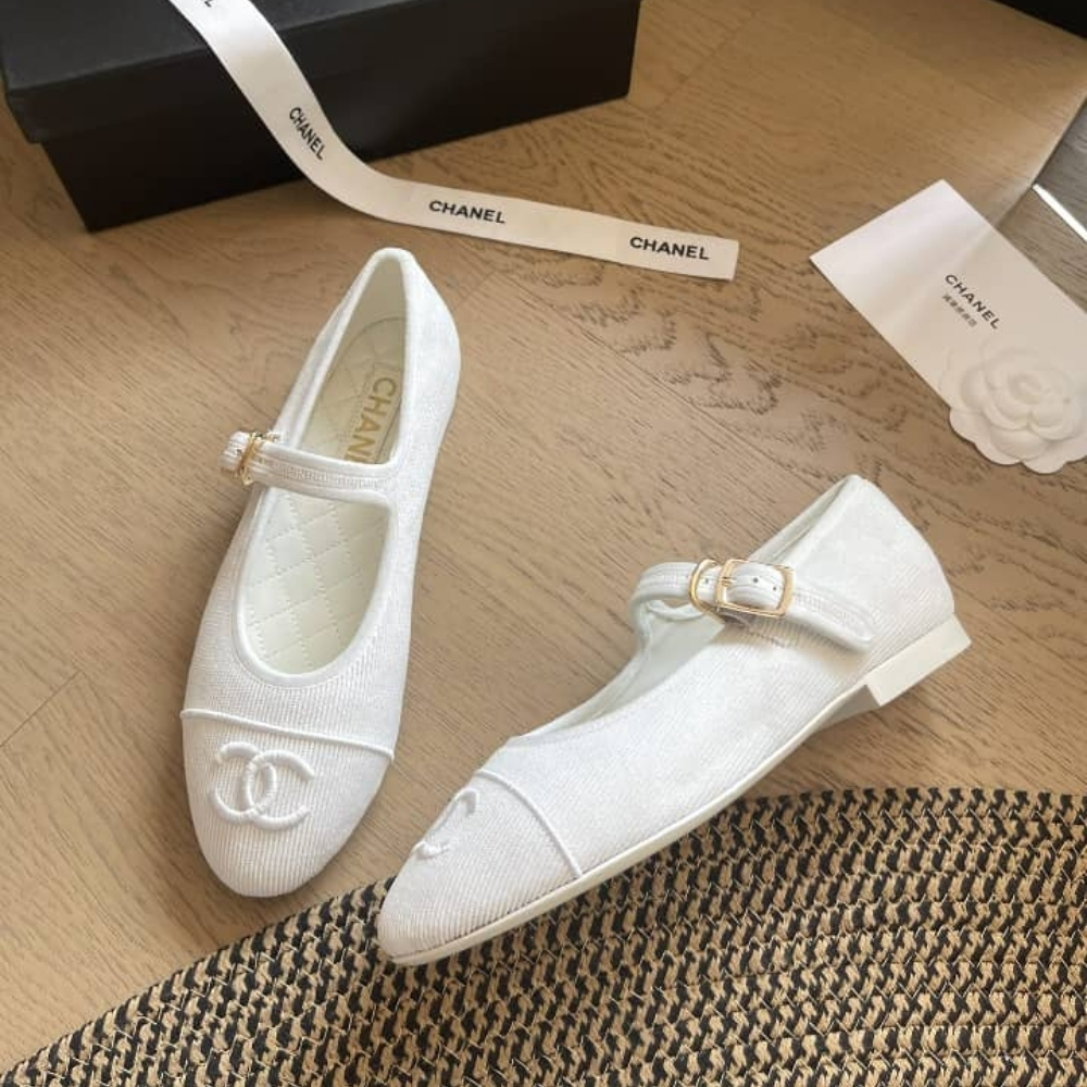 The Chanel Mary Jane Ballet Flats in white are a sophisticated take on a classic silhouette, featuring a clean fabric finish and the iconic CC logo embroidered on the toe. The design is elevated by an elegant instep strap with a polished gold-tone buckle, ensuring a secure and comfortable fit for all-day wear. With their luminous white palette and timeless Parisian charm, these flats effortlessly complement everything from tailored trousers to airy seasonal dresses.