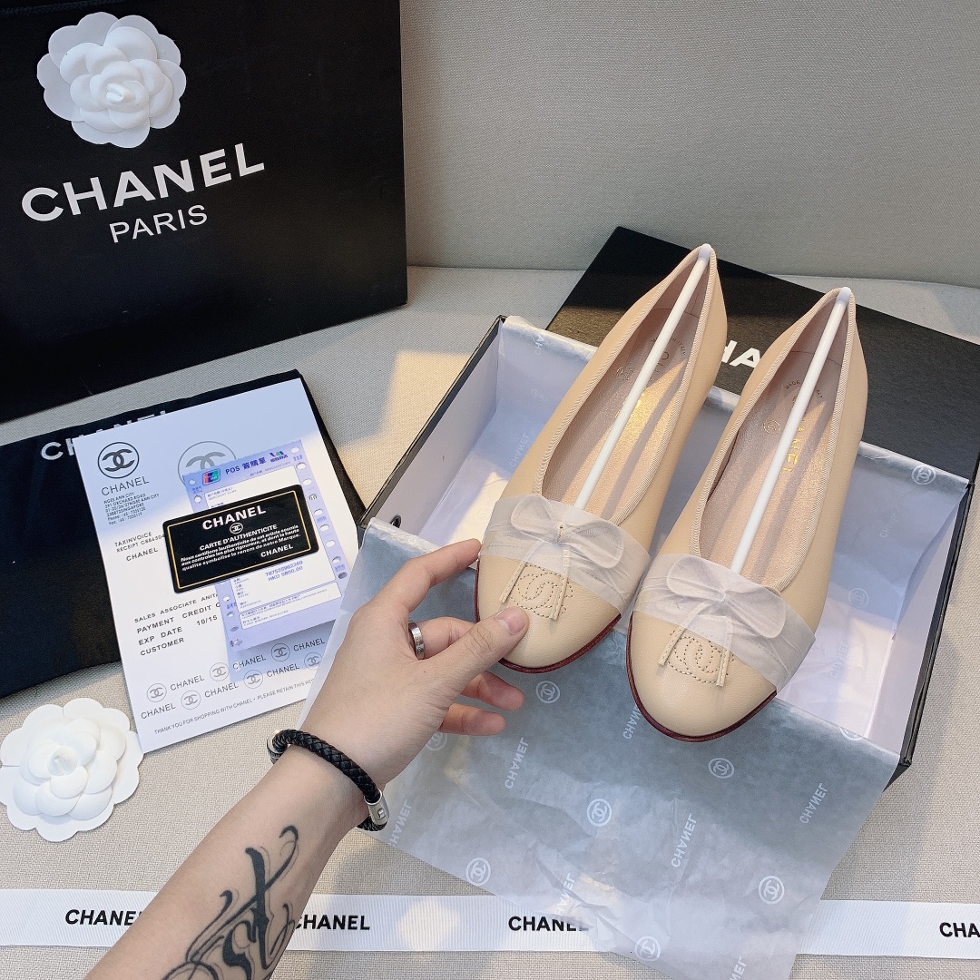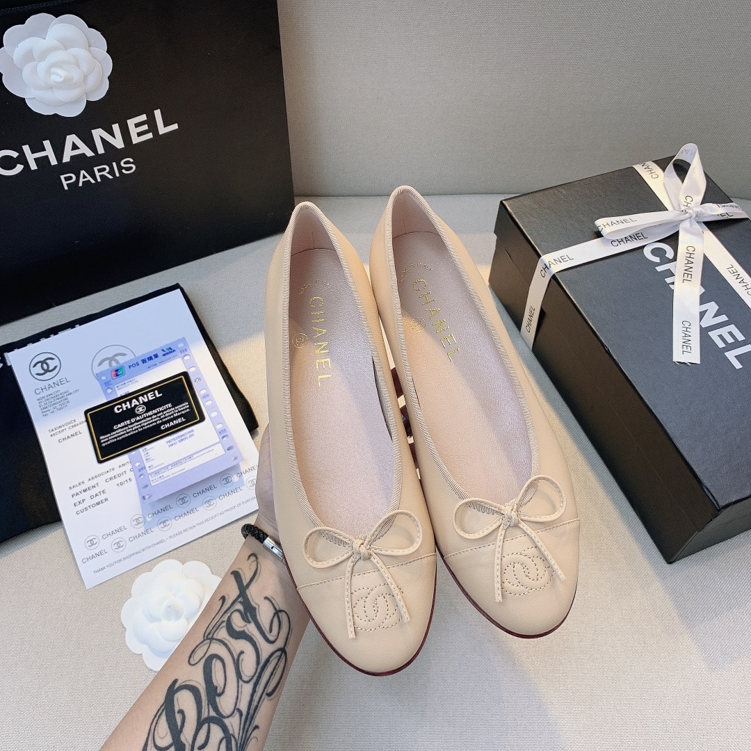 The Chanel Women’s Classic Ballet Flats in Ivory exude timeless elegance and Parisian charm. Crafted from premium leather, these ballet flats feature the iconic Chanel CC logo delicately embroidered on the rounded toe, accentuated by a sheer ribbon bow for a touch of femininity. The soft beige hue is versatile and effortlessly chic, while the cushioned insole ensures all-day comfort. Finished with a subtle contrast sole, these flats are perfect for elevating both casual and sophisticated ensembles.