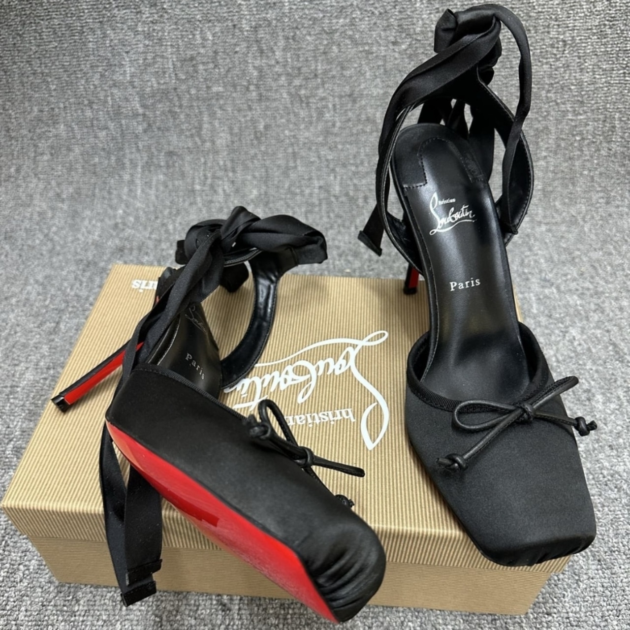 These are Christian Louboutin platform heels crafted in black satin. They feature a square toe, delicate front bow, high stiletto heel, and signature red sole. The ankle is wrapped with elegant ribbon ties, adding a chic and feminine ballet-inspired touch.