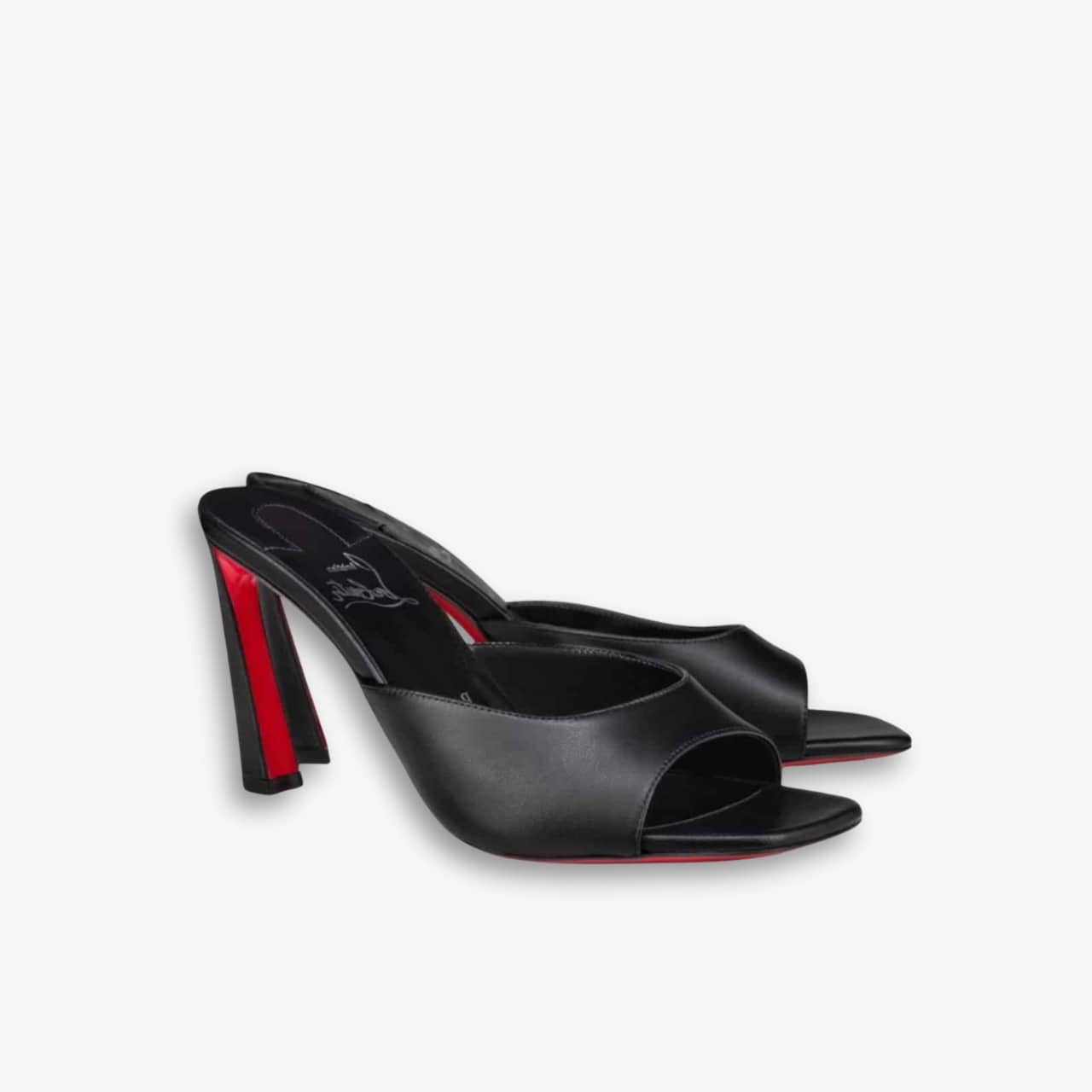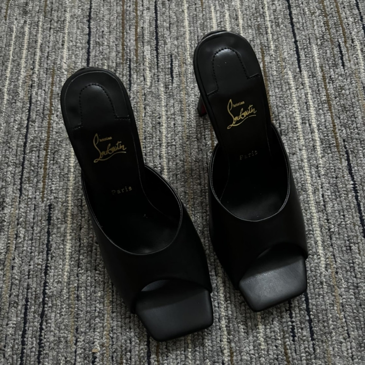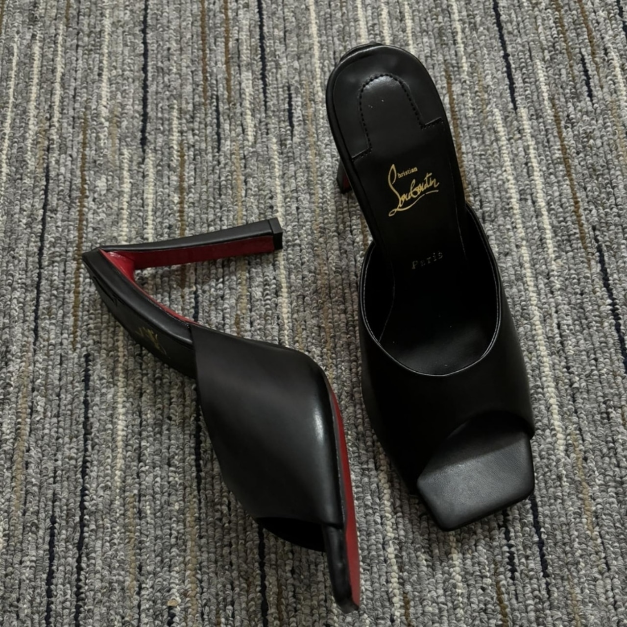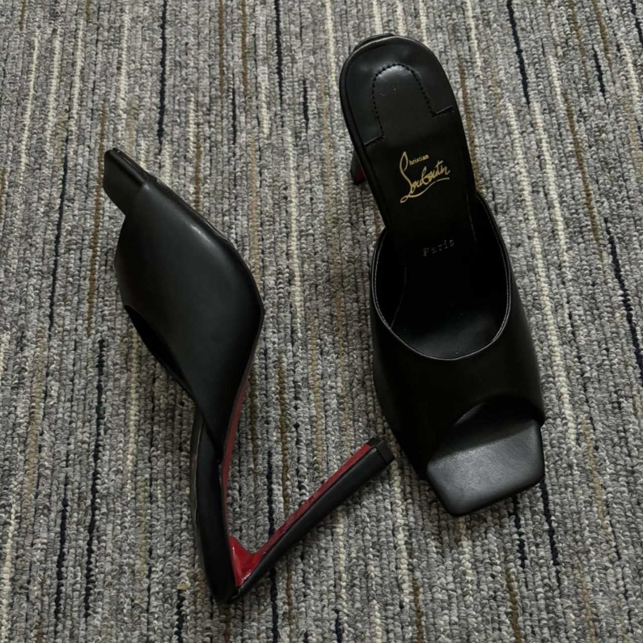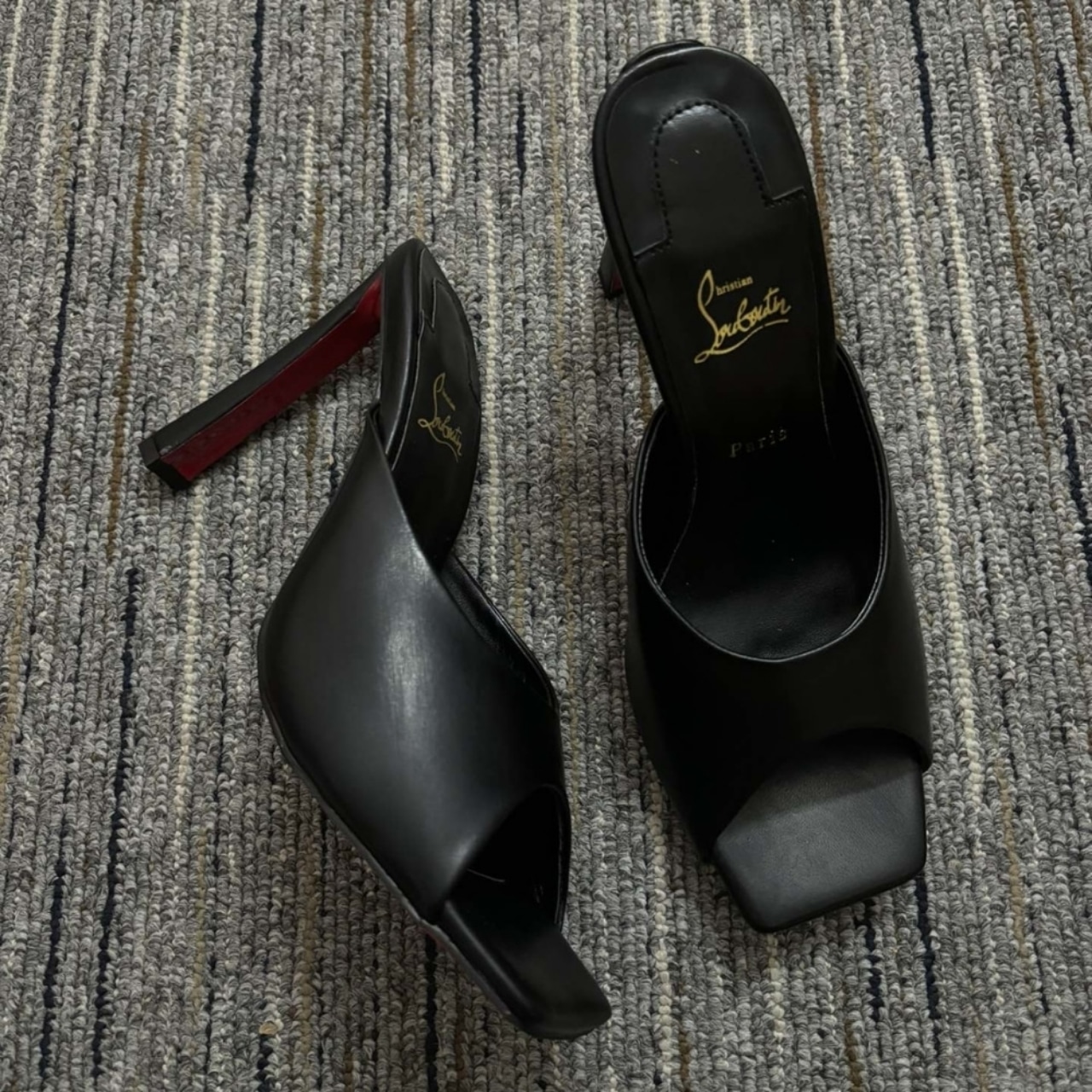 These are Christian Louboutin open-toe mules in black. They feature a high block heel and the brand’s iconic red sole, adding a bold yet elegant touch. Perfect for both chic daytime outfits and sophisticated evening looks.