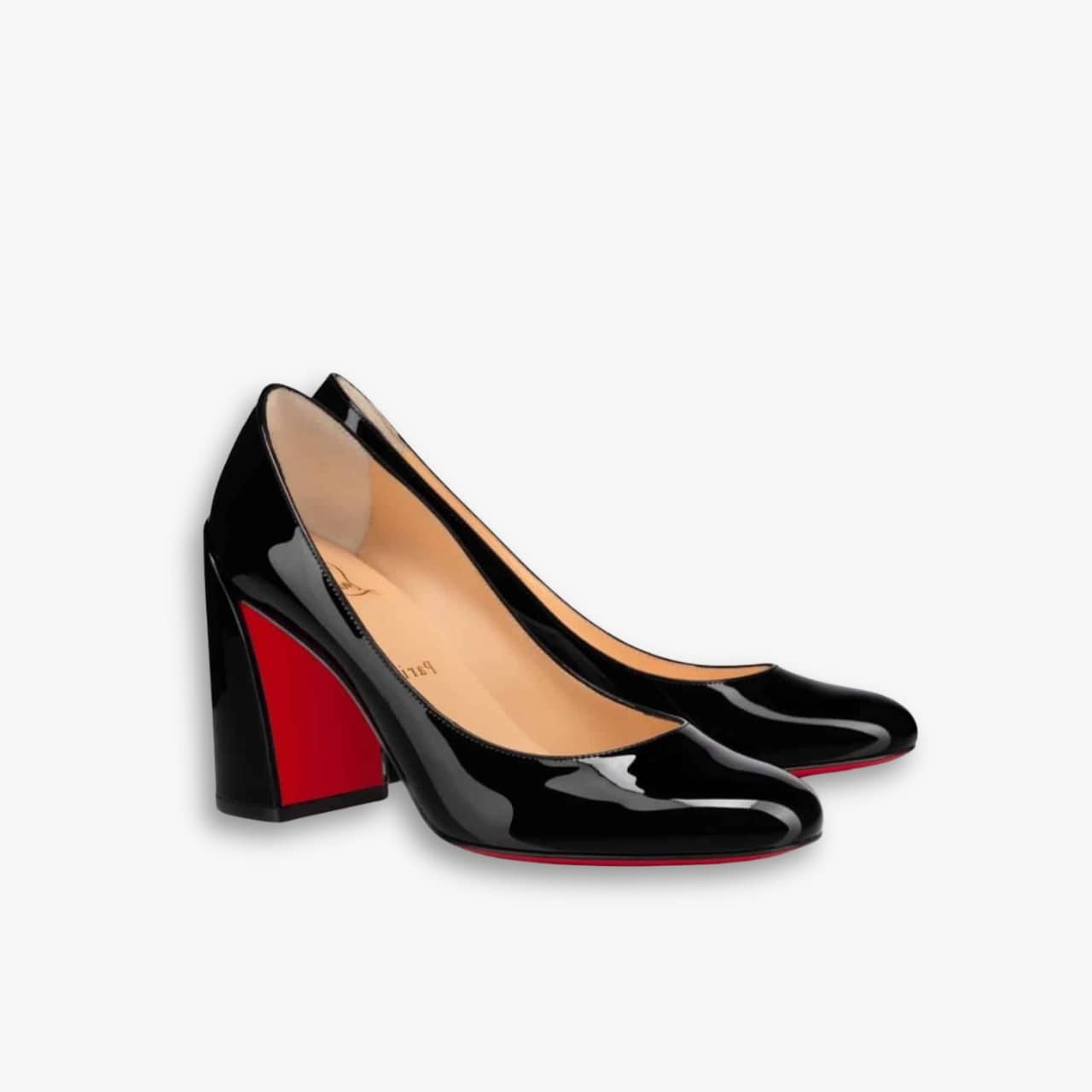 These are Christian Louboutin block heel pumps in glossy black. They feature a rounded toe and the signature red sole, offering both elegance and comfort. A timeless design that combines sophistication with everyday wearability.