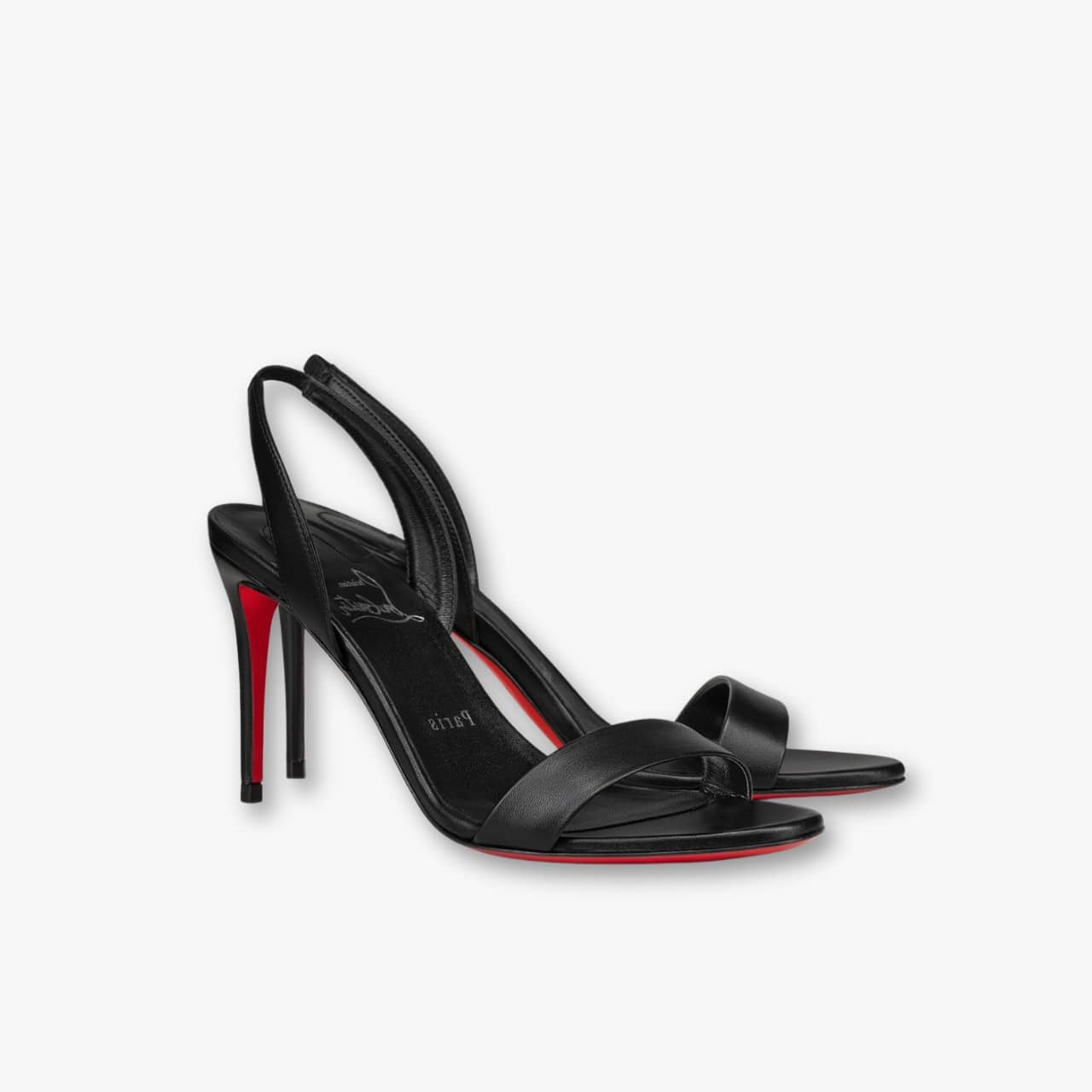 The O Condora sandal offers a minimalist design with bold impact, crafted in glossy black patent leather. A delicate ankle strap and open toe sit atop a stiletto heel for a striking look. Finished with the iconic red sole for unmistakable allure.