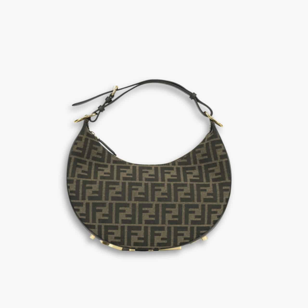 The Fendigraphy small hobo crafted FF jacquard motif fabric and embellished with gold FENDI lettering across the base visible when worn on the shoulder. The adjustable shoulder strap allows for crossbody wear.