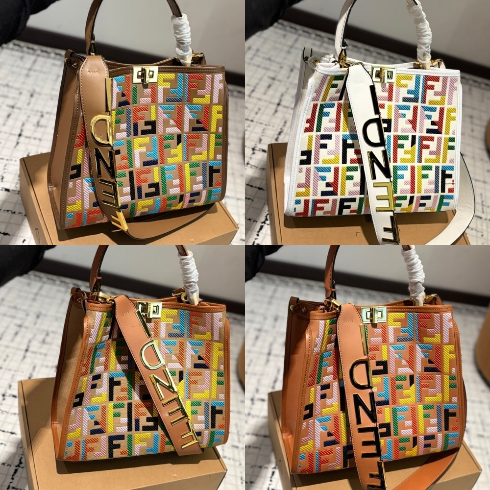 Suddenly lugging your bag everywhere doesn’t look so bad, especially when you have something as chic as this Peekaboo FF Logo Handbag from Fendi. This bag is designed with the signature FF monogram canvas, a structured top handle, gold-tone twist-lock fastening, and a bold FENDI-lettered shoulder strap—perfect for adding sophistication to any look.