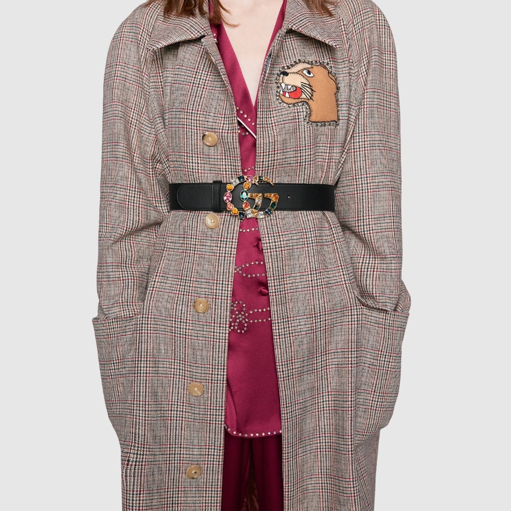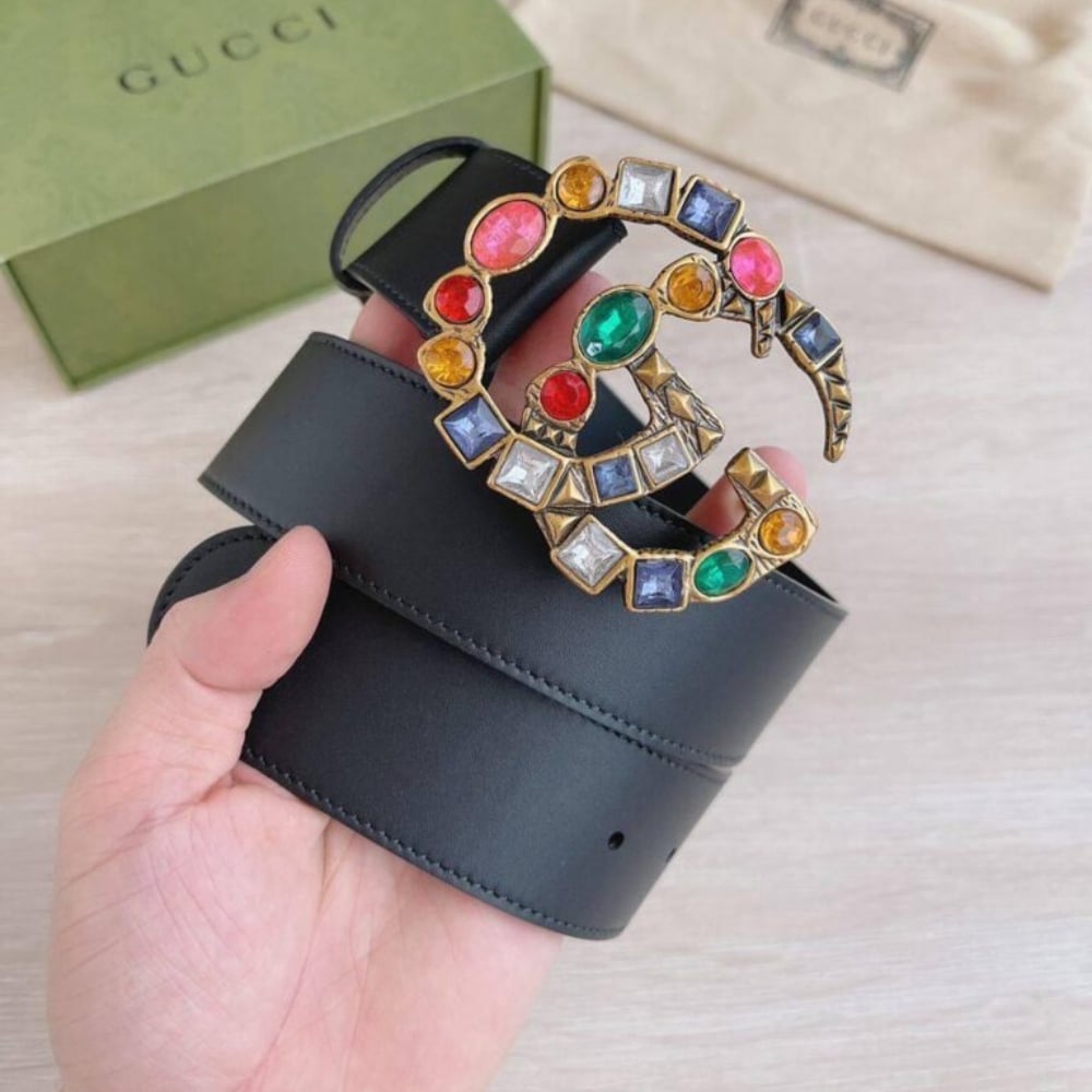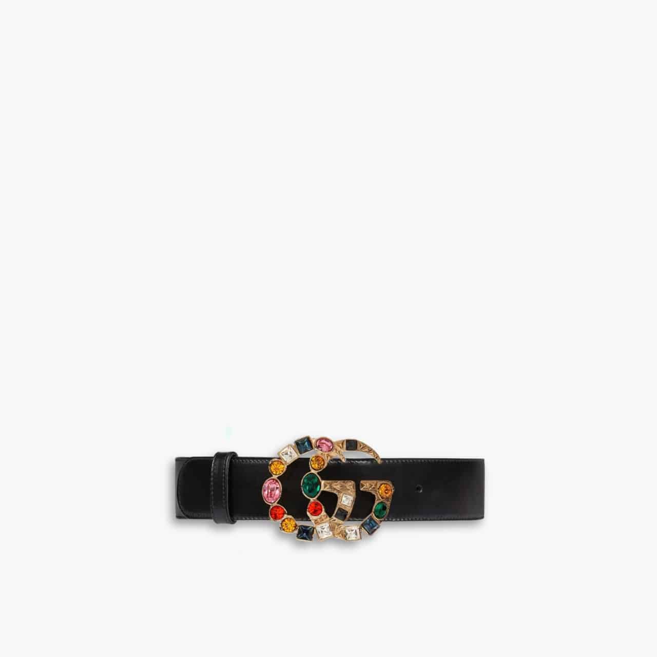 This Gucci belt features a black leather strap and a statement GG buckle adorned with colorful, jewel-like stones. Bold and luxurious, it adds a pop of personality to any outfit.