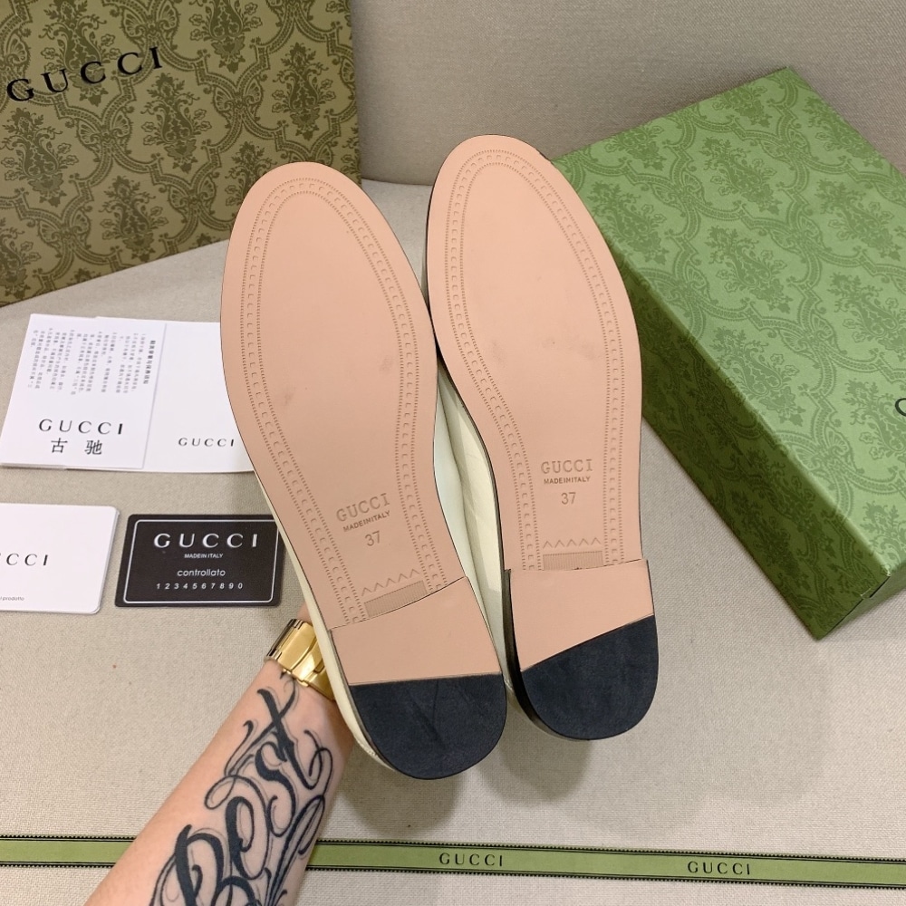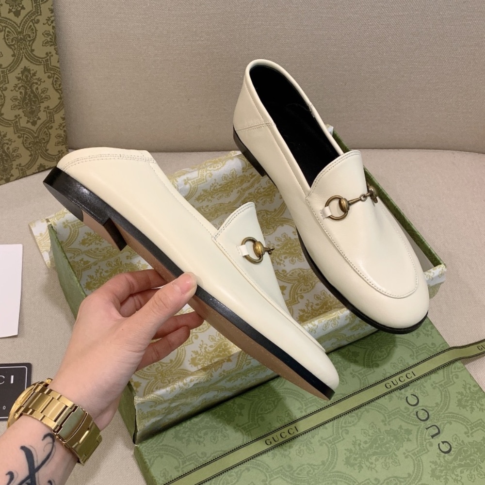 White leather loafers with Gucci’s signature gold Horsebit – simple, classic, and easy to style.