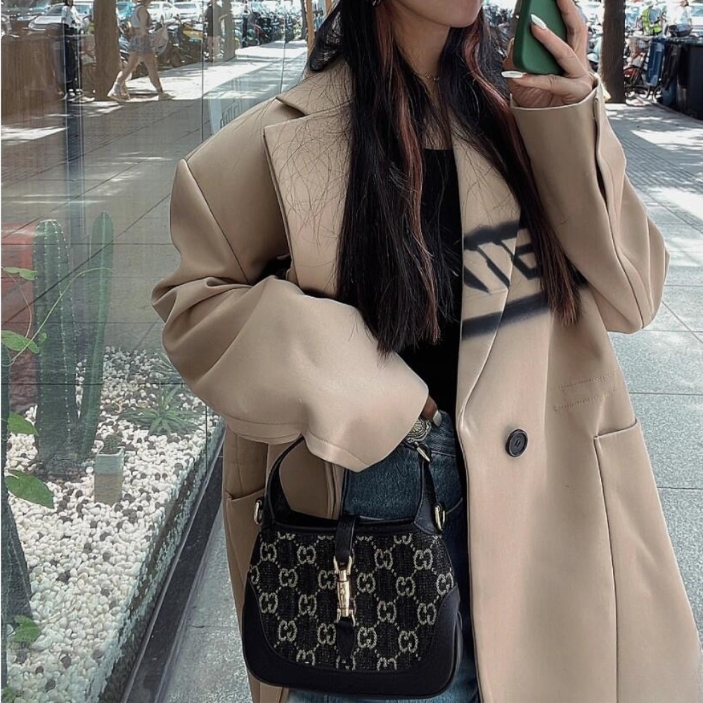 Heritage elements are reimagined with a contemporary twist throughout the Gucci Aria collection. The Jackie 1961 is reimagined as a rectangular tote with a soft, flexible structure. Taken from the archives, logo details such as the allover GG motif and the Web stripe deepen the accessory’s connection to Gucci’s history. The mini bag is completed by a black leather trim and the line’s signature gold-toned piston hardware.