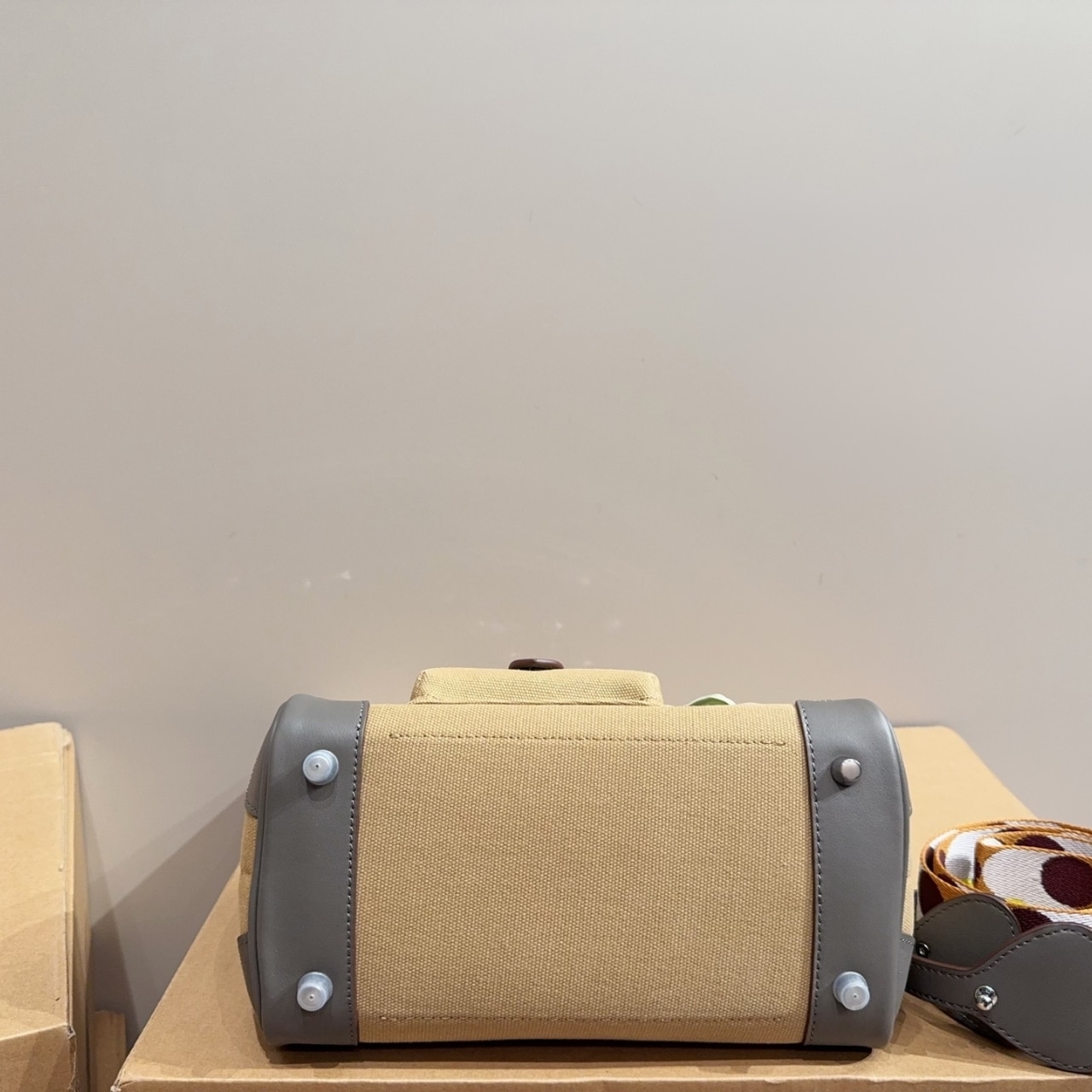 This handbag features a sophisticated combination of beige canvas and dark leather accents, creating a timeless and elegant look. It includes a front pocket, sturdy top handles, and a secure lock detail for both style and functionality. Perfect for both casual and formal settings, it offers durability and a touch of luxury.
