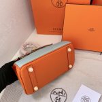This handbag stands out with its eye-catching color combination and elegant structure. The soft pastel blue body contrasts beautifully with the warm tan flap and vibrant orange handles and trim, creating a refined yet lively look. The gold-tone hardware adds a touch of sophistication, while the clean lines and balanced proportions give the bag a timeless, graceful appeal.