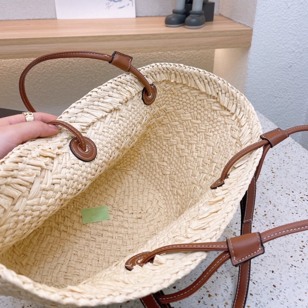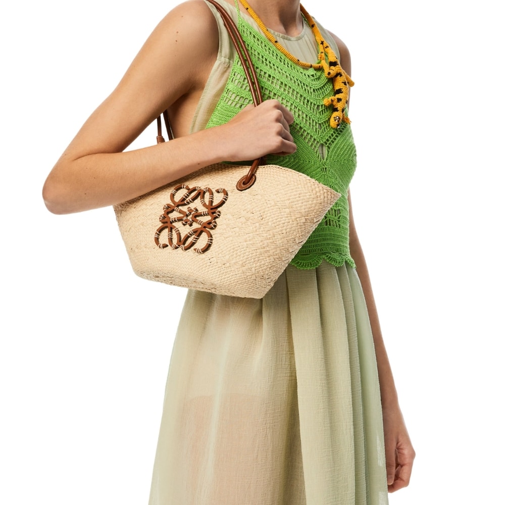 The Anagram Basket is a traditional bag with a classic handwoven body, tubular leather straps and an embroidered LeatherAnagram. This small version using iraca palm leaves that have been cultivated, harvested, sun-dried and handwoven.