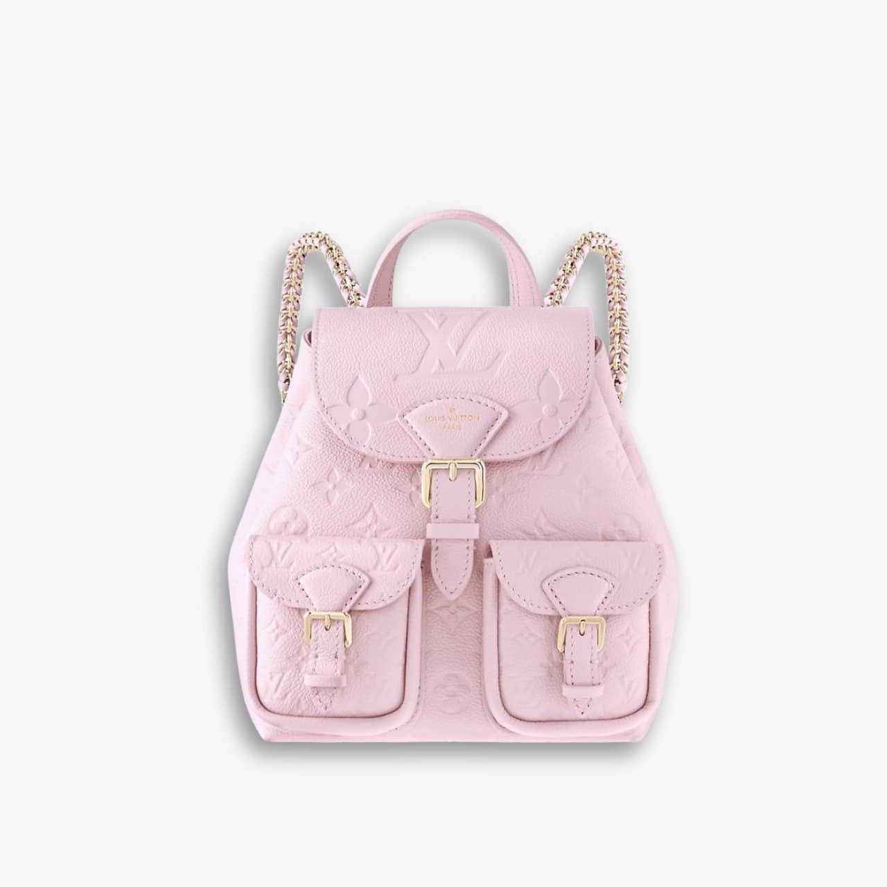 Crafted in Monogram Empreinte leather, this compact backpack in soft pink blends elegance with playful charm. Gold-tone hardware and chain straps elevate its chic, feminine look. Ideal for hands-free styling with a luxe twist.