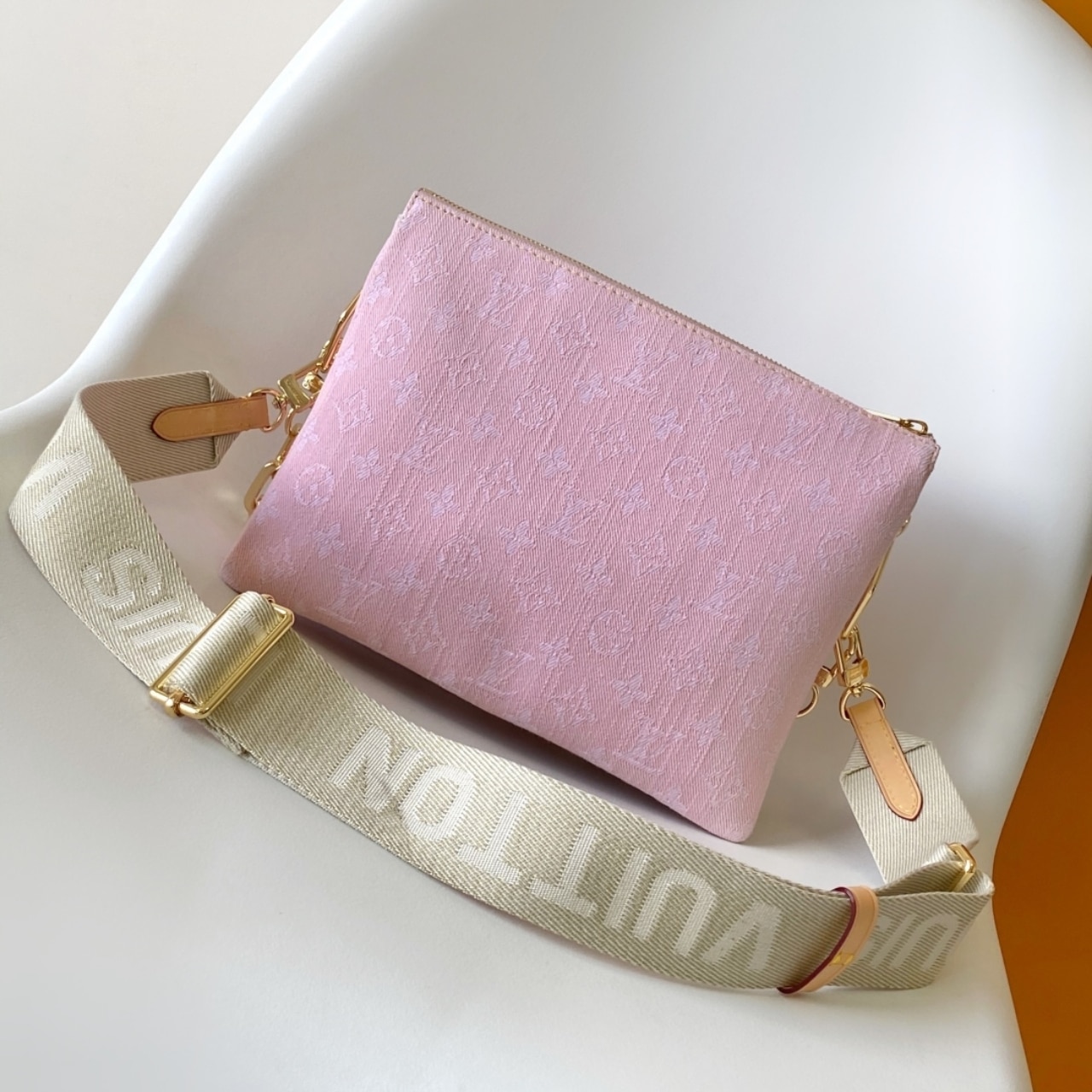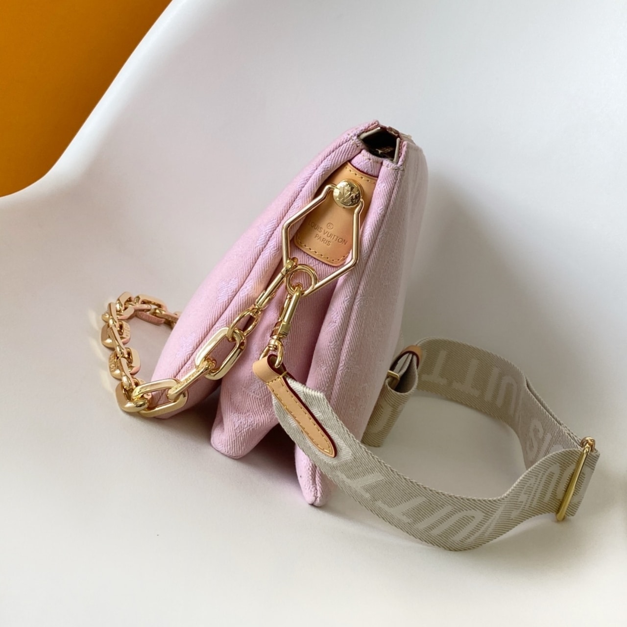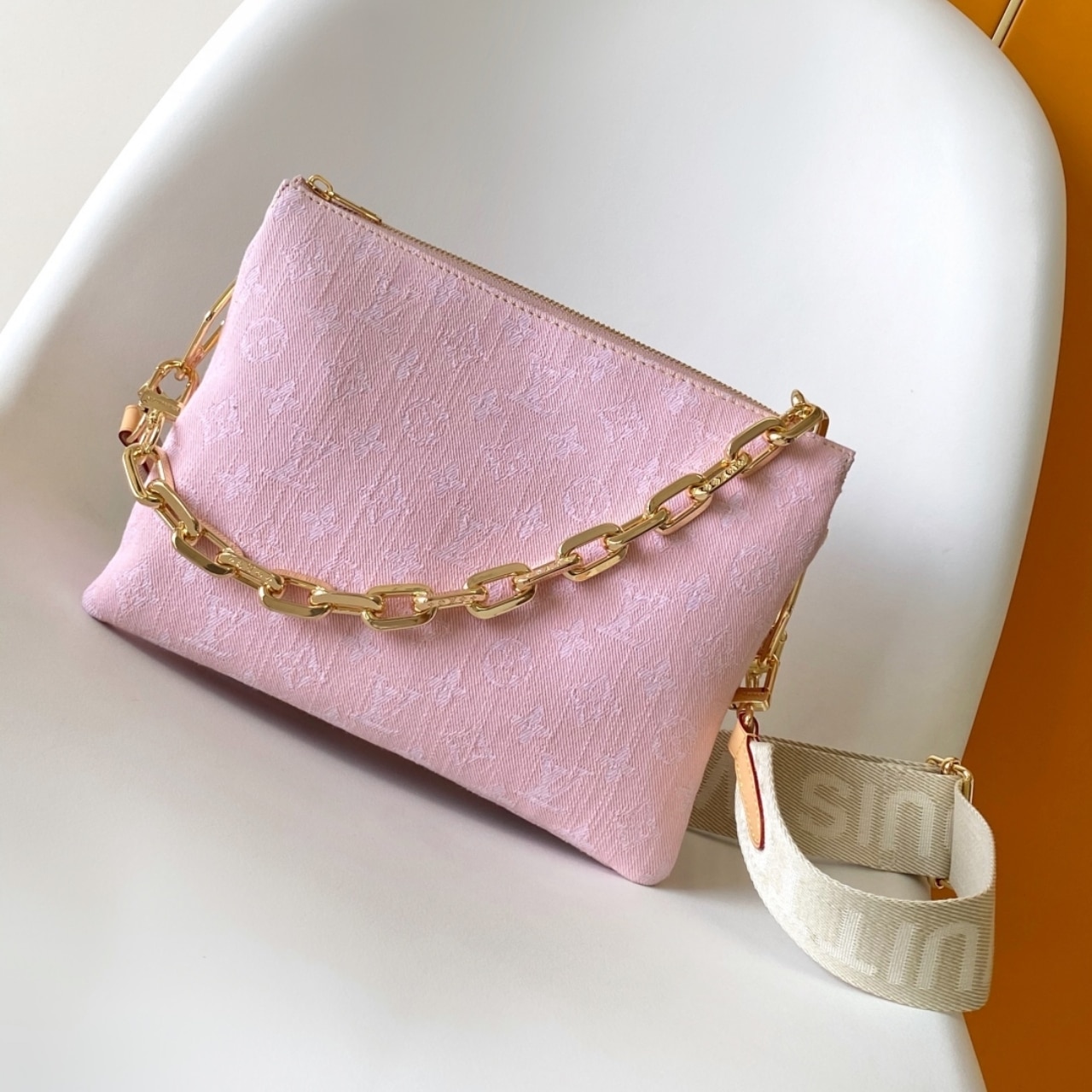 A statement addition to the Coussin line, this PM model showcases the revival of the House’s 2005 Monogram Denim pattern. The signature chunky LV chain is removable, offering multiple carry options.