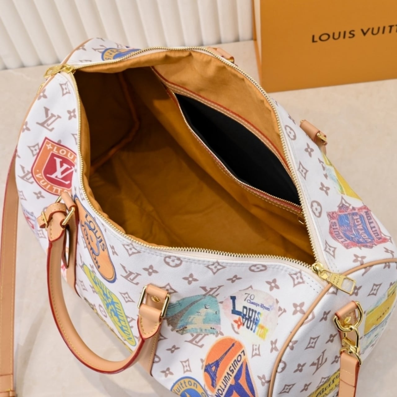 The Louis Vuitton Keepall Bandoulière 45 in Monogram Dune coated canvas features a spacious design with a chic, neutral color. Its 45cm size provides ample room for travel essentials. The adjustable shoulder strap ensures comfort and versatility.