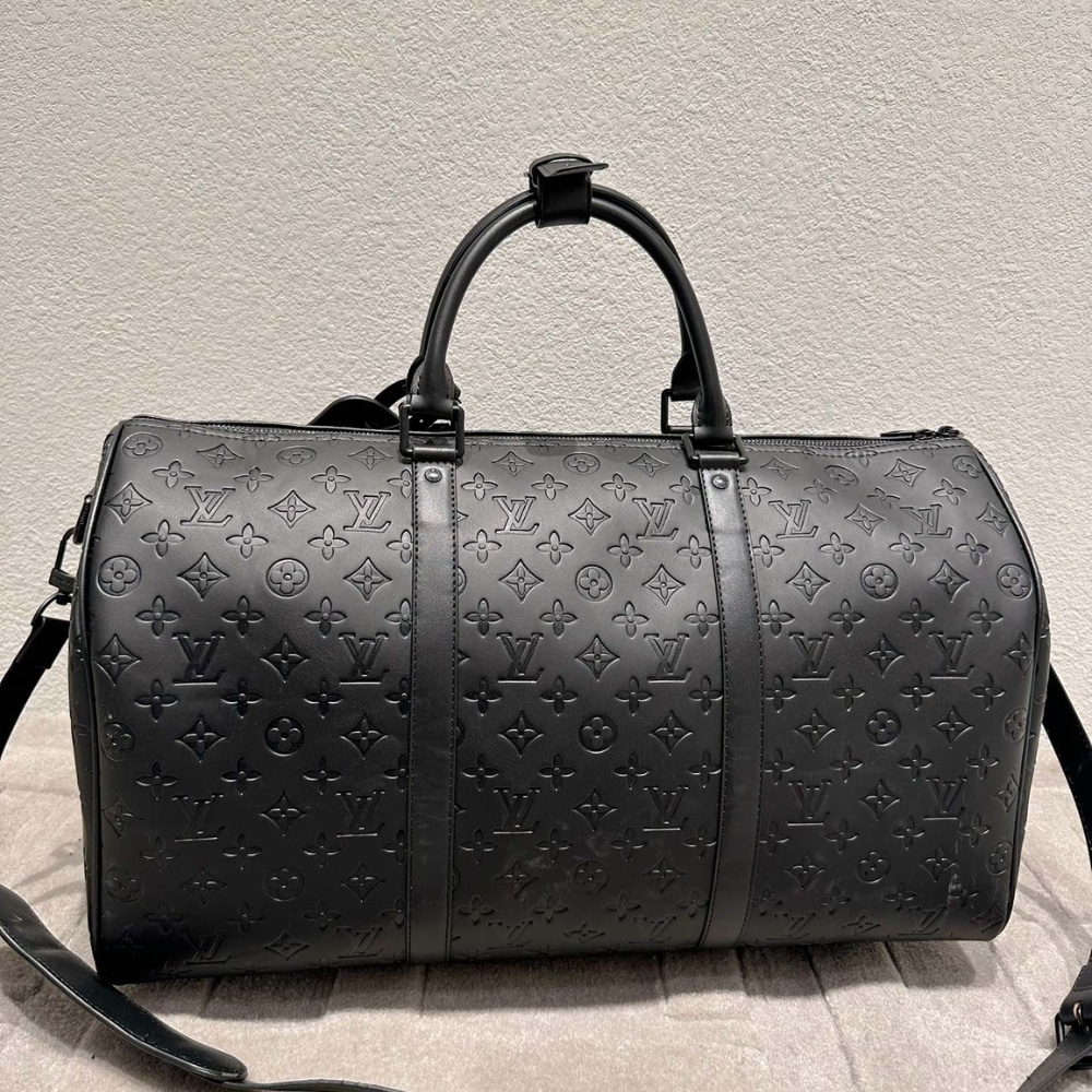 The Louis Vuitton Keepall Bandoulière 50 in Monogram Shadow leather (model number M44810) is a sophisticated travel bag that combines functionality with elegant design. Crafted from black Monogram Shadow, the bag is embossed with Louis Vuitton’s iconic Monogram pattern.