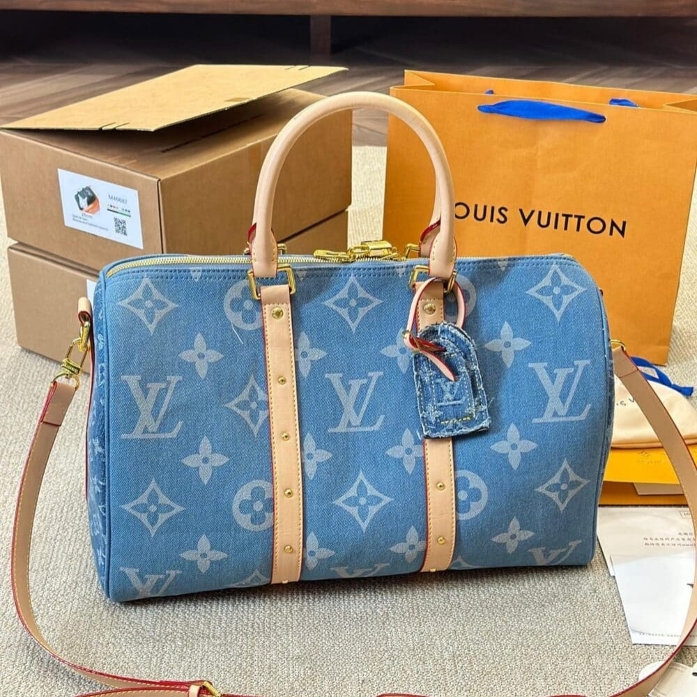 Elevate your travel style with the Louis Vuitton Keepall Bandoulière Denim Blue 45cm M24315. This eye-catching travel bag, crafted from a unique denim blue material, features refined leather trimmings, polished hardware, and a comfortable shoulder strap.