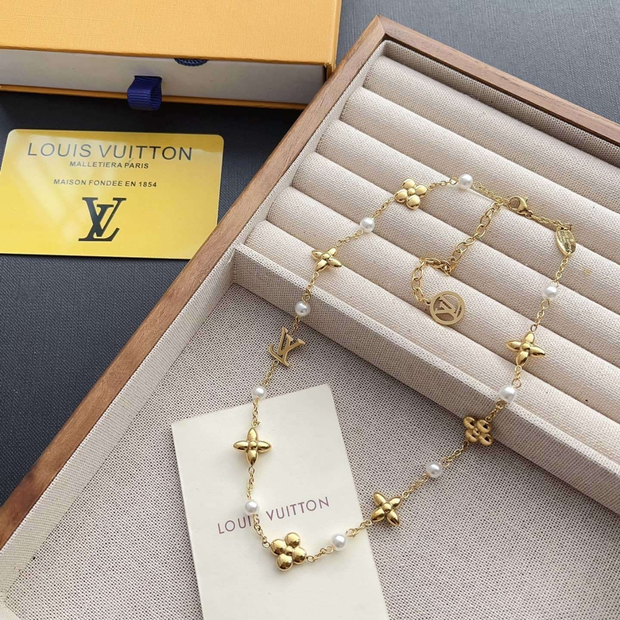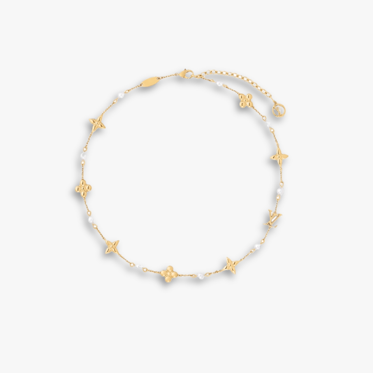 This is a Louis Vuitton necklace featuring the brand’s iconic Monogram Flower motifs and LV initials. The design alternates between polished gold-tone charms and delicate white pearls, creating a refined and feminine look.