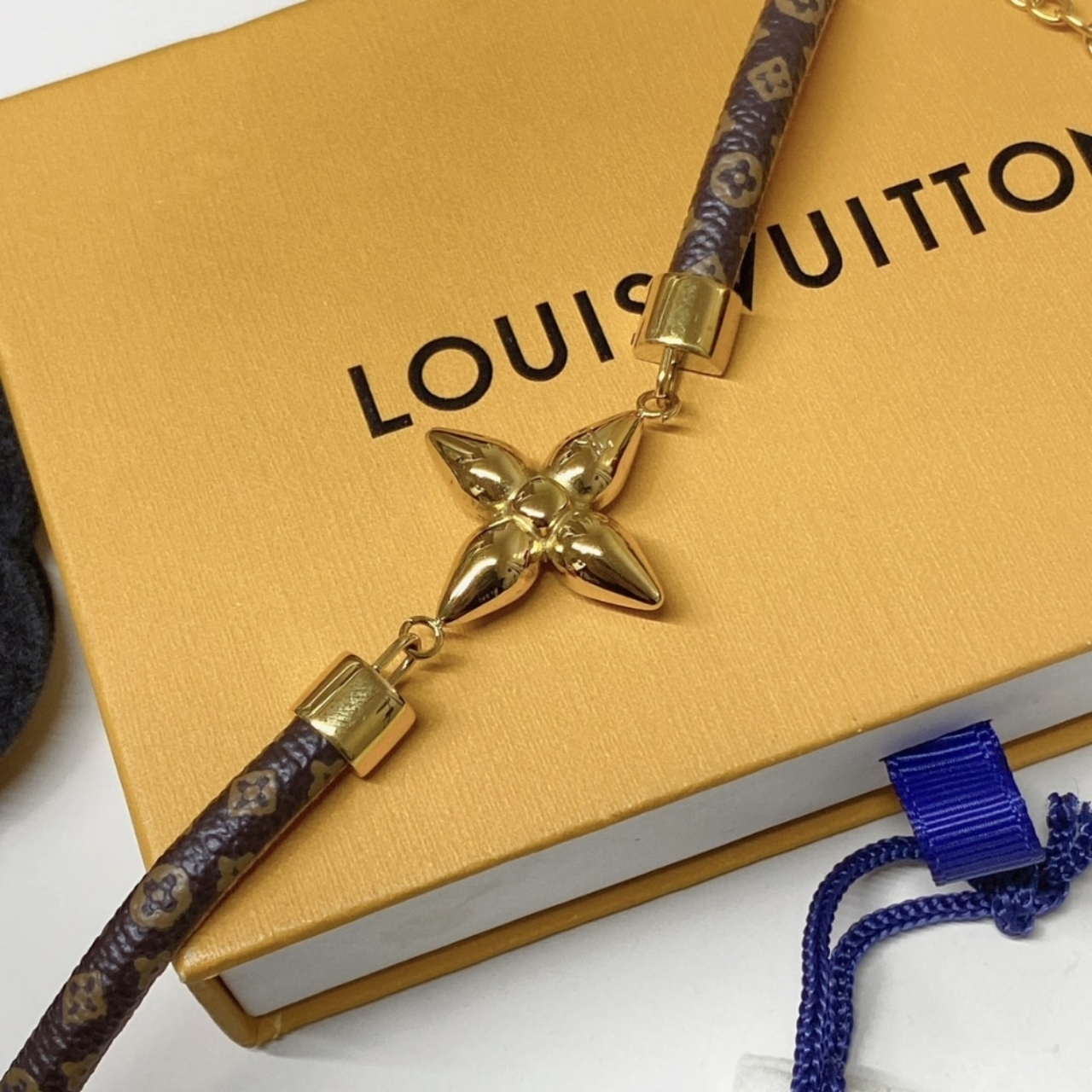 This Louis Vuitton bracelet showcases a refined balance of luxury and design. It features a gold-tone Monogram Flower centerpiece with a delicate LV charm. The slim brown strap enhances its sophisticated aesthetic, making it a timeless accessory perfect for adding a subtle touch of elegance to any look.