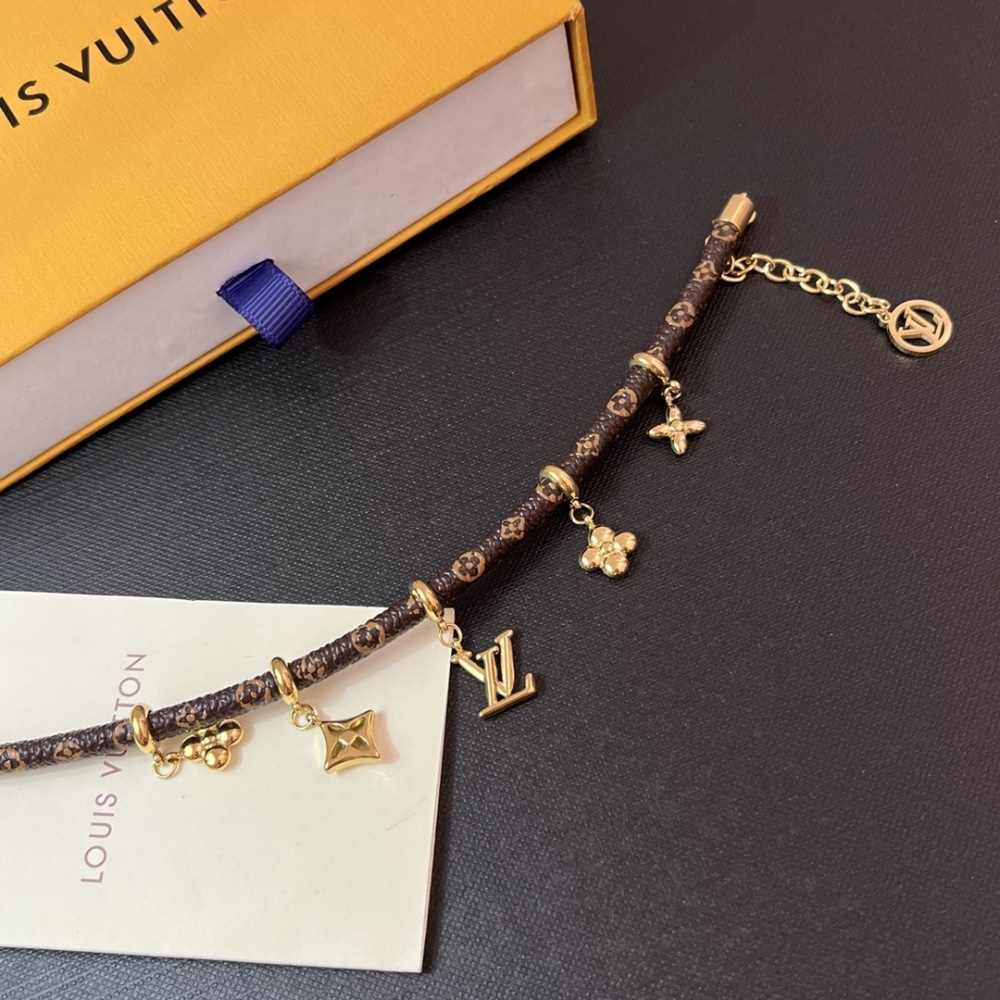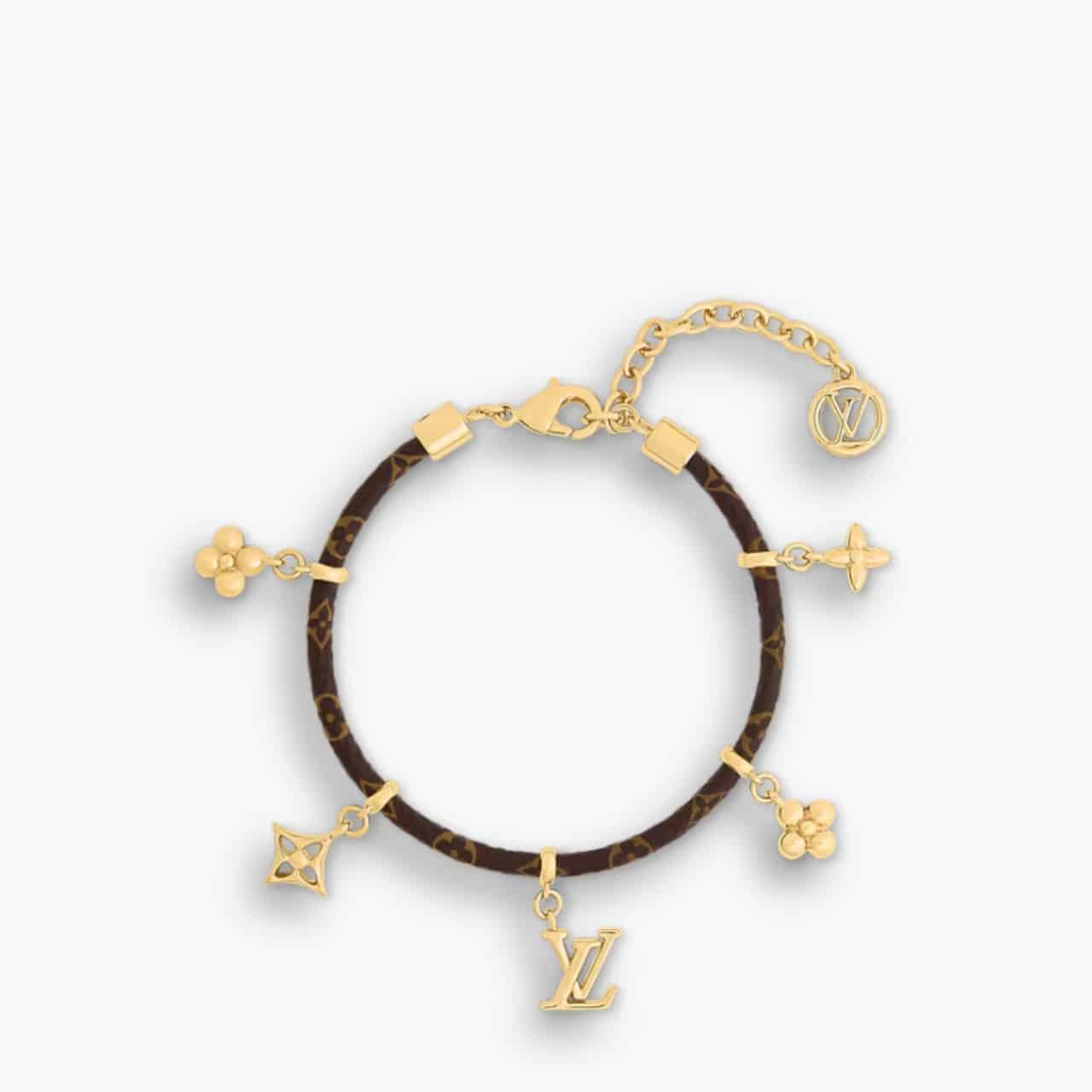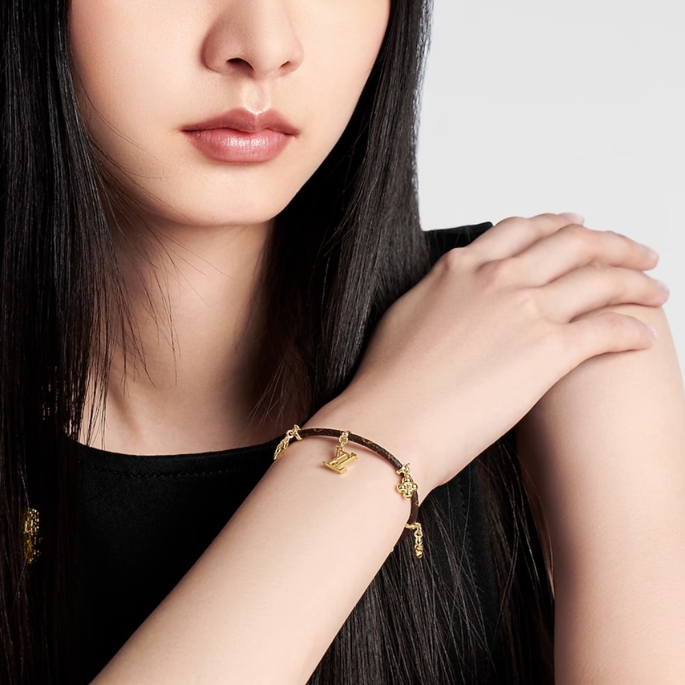 The cool and elegant LV Blooming bracelet features an eye-catching array of historic House icons. Suspended from a Monogram canvas cord, an LV Initials charm is surrounded by a quartet of Monogram Flowers, all crafted in lustrous gold-finish metal. And the adjustable chain holds an LV Circle charm for a final signature flourish.