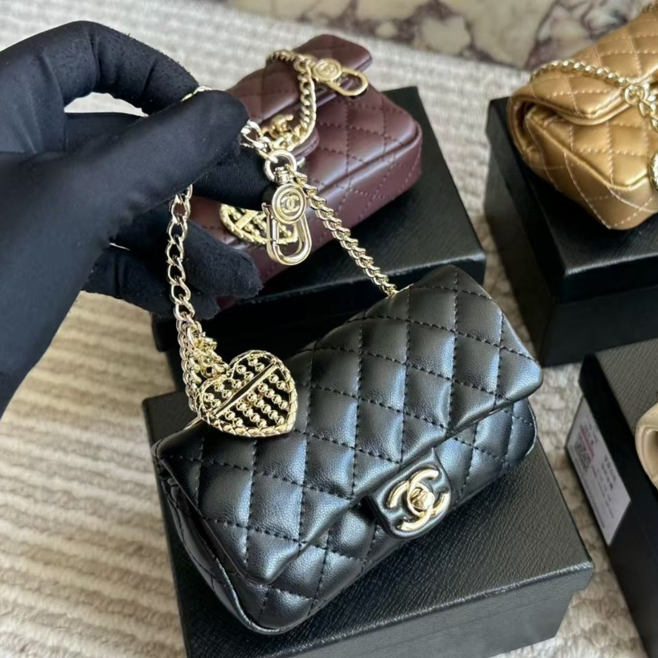 This Chanel mini flap bag has black with gold-tone hardware. It features the iconic CC turn-lock closure and a chic chain handle. A pearl and crystal heart charm adds a touch of elegance and playfulness.