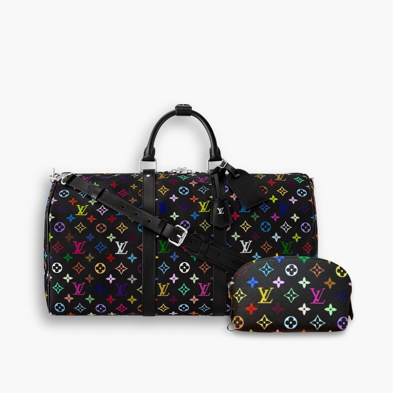 The iconic Keepall Bandoulière makes a bold signature statement in Monogram coated canvas that has been playfully reimagined with vibrant rainbow tones inspired by the work of world-renowned Japanese artist Takashi Murakami. Sleek black leather bands add structure to the roomy cabin-sized design, complete with elegant top handles and a removable, adjustable strap. A padlock, a name tag and a keybell complete the look with a nod to the House’s travel heritage.
