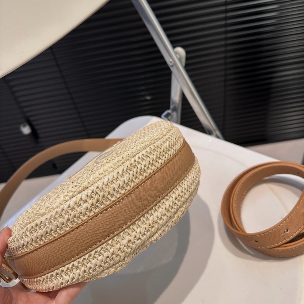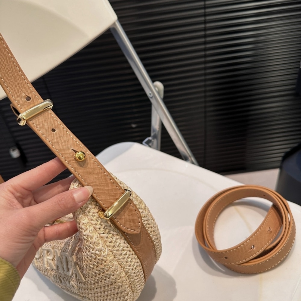 The softly curved silhouette of Prada’s Arqué shoulder bag nods to the brand’s penchant for minimalist accessories with a distinctive twist. Crafted from woven raffia with leather trims, it’s decorated with logo lettering at the front and the iconic enamel triangle at the back.