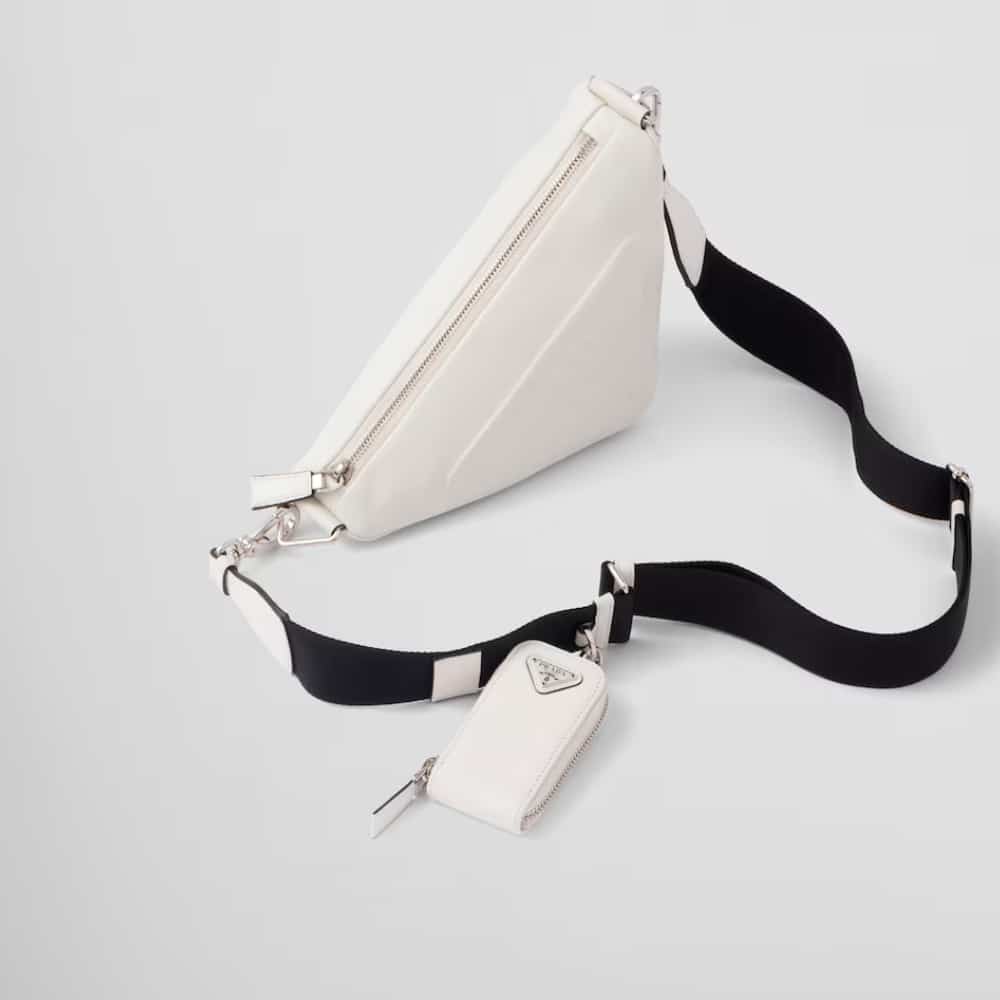 The Prada Triangle Leather Shoulder Bag in White (27 cm) showcases sleek, geometric elegance with its iconic shape. Featuring a tonal embossed logo and enameled triangle accent, it combines minimalist aesthetics with versatile functionality. A timeless fusion of Prada’s heritage and modern design.