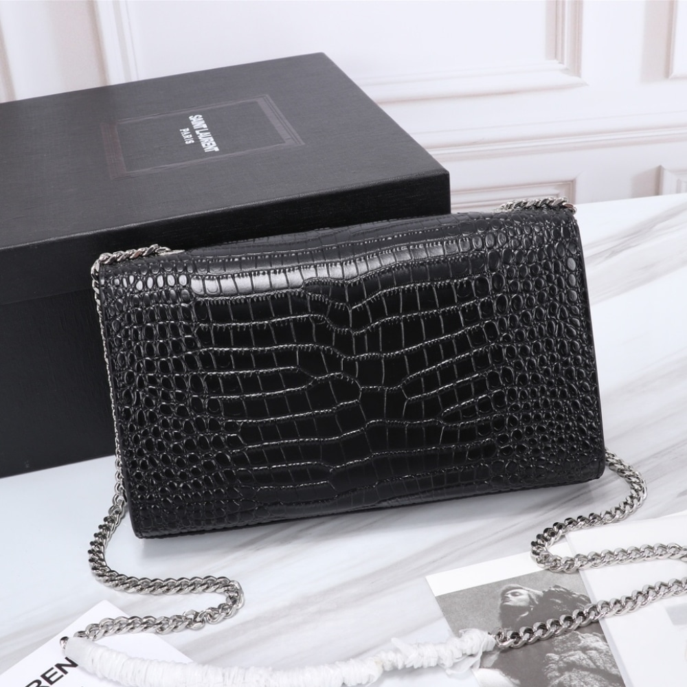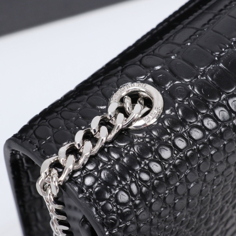 The Saint Laurent Kate Medium Tassel in Crocodile Mirror Effect Black (24cm) showcases shiny crocodile-embossed leather, the iconic CASSANDRE logo, and a chain tassel for an elegant touch. This chic and structured shoulder bag is lined with grosgrain and features mirror-effect hardware for a luxurious finish.