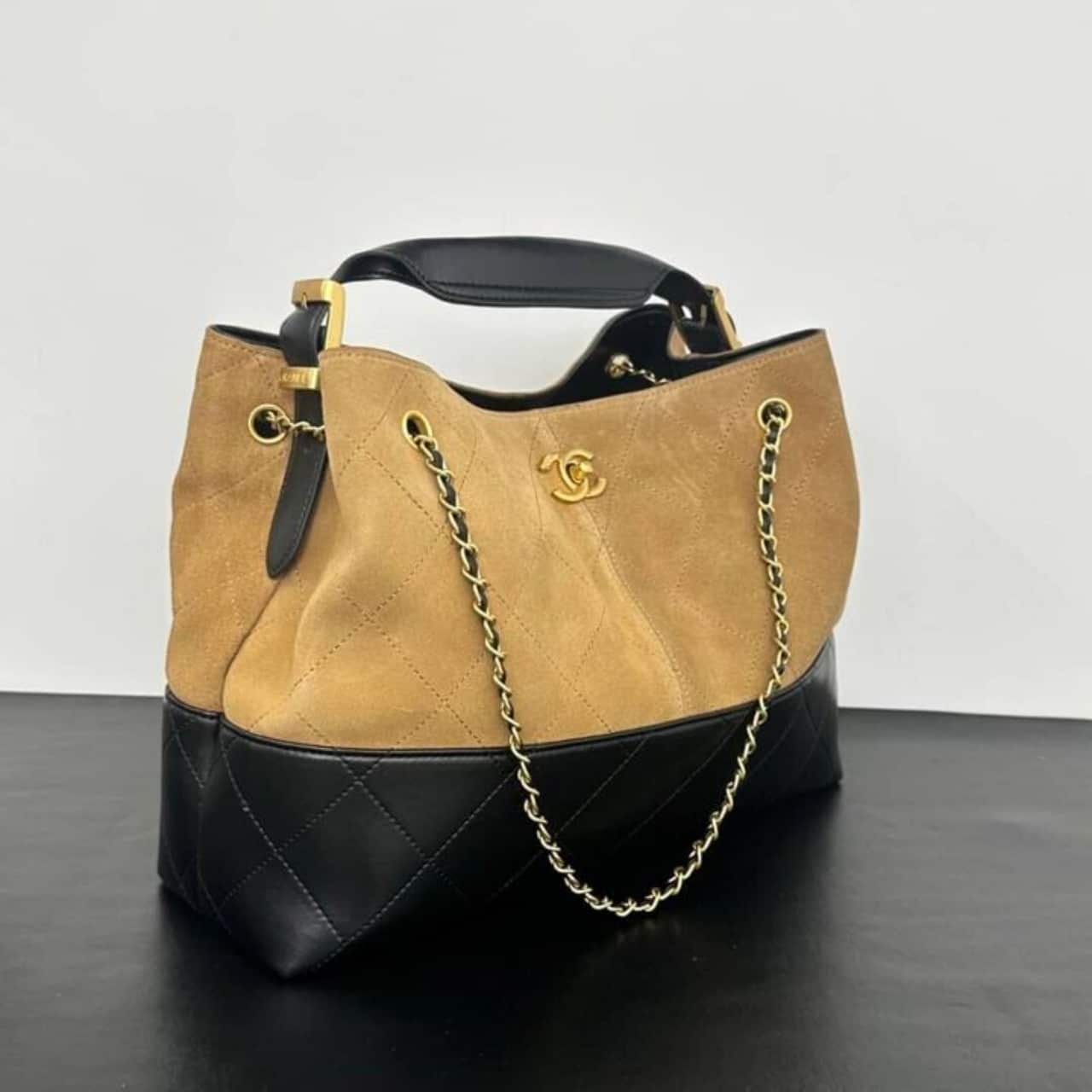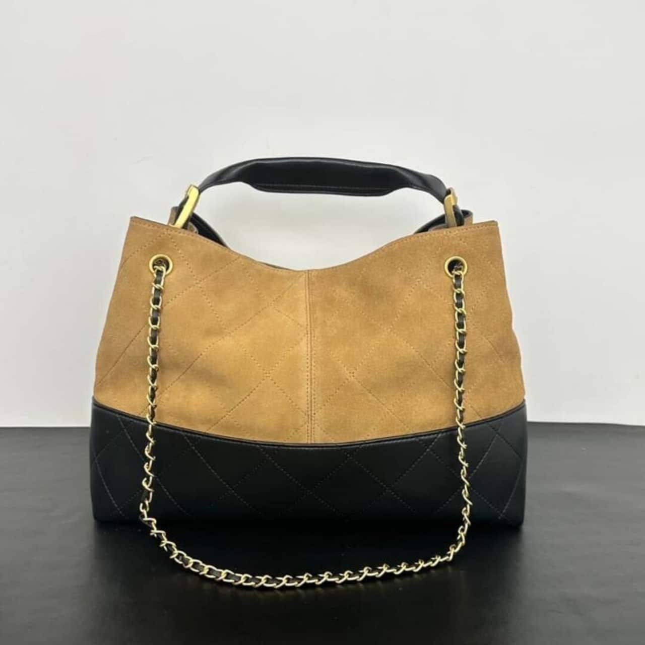 A luxurious beige and black shopping bag with gold-tone metal accents. Spacious and stylish, this bag is perfect for daily use or as a statement accessory.