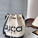 This is a Gucci bucket bag crafted in canvas with bold black “GUCCI Made in Italy” lettering. It features a drawstring closure with leather accents. Casual yet chic, this design blends modern streetwear style with classic luxury craftsmanship.