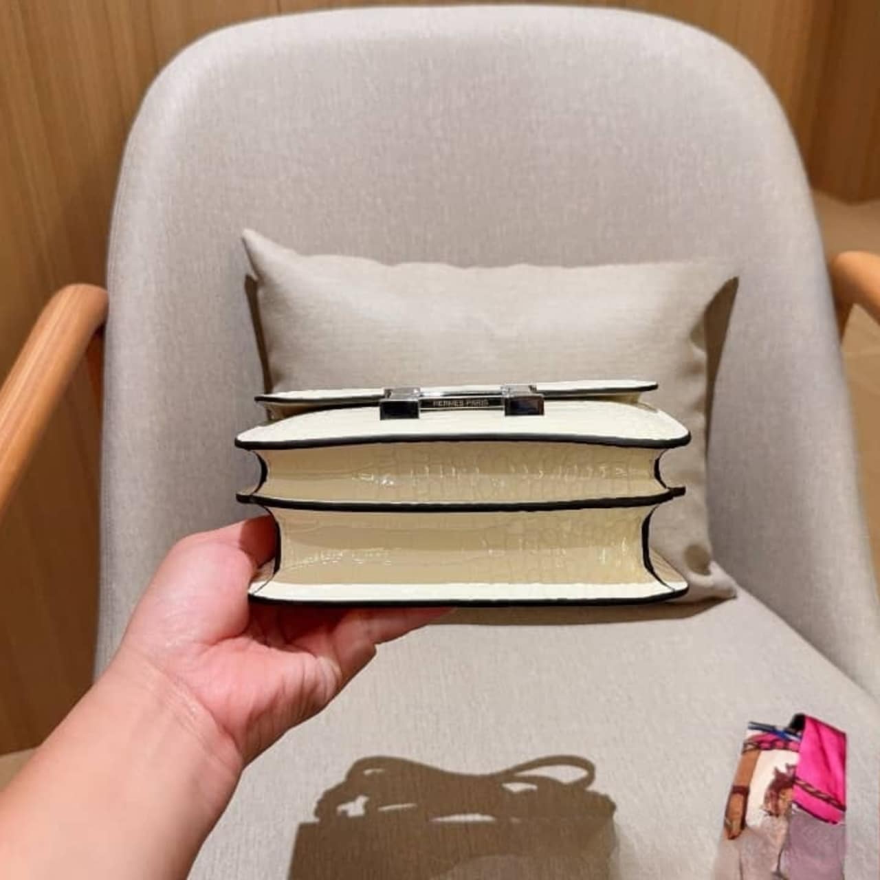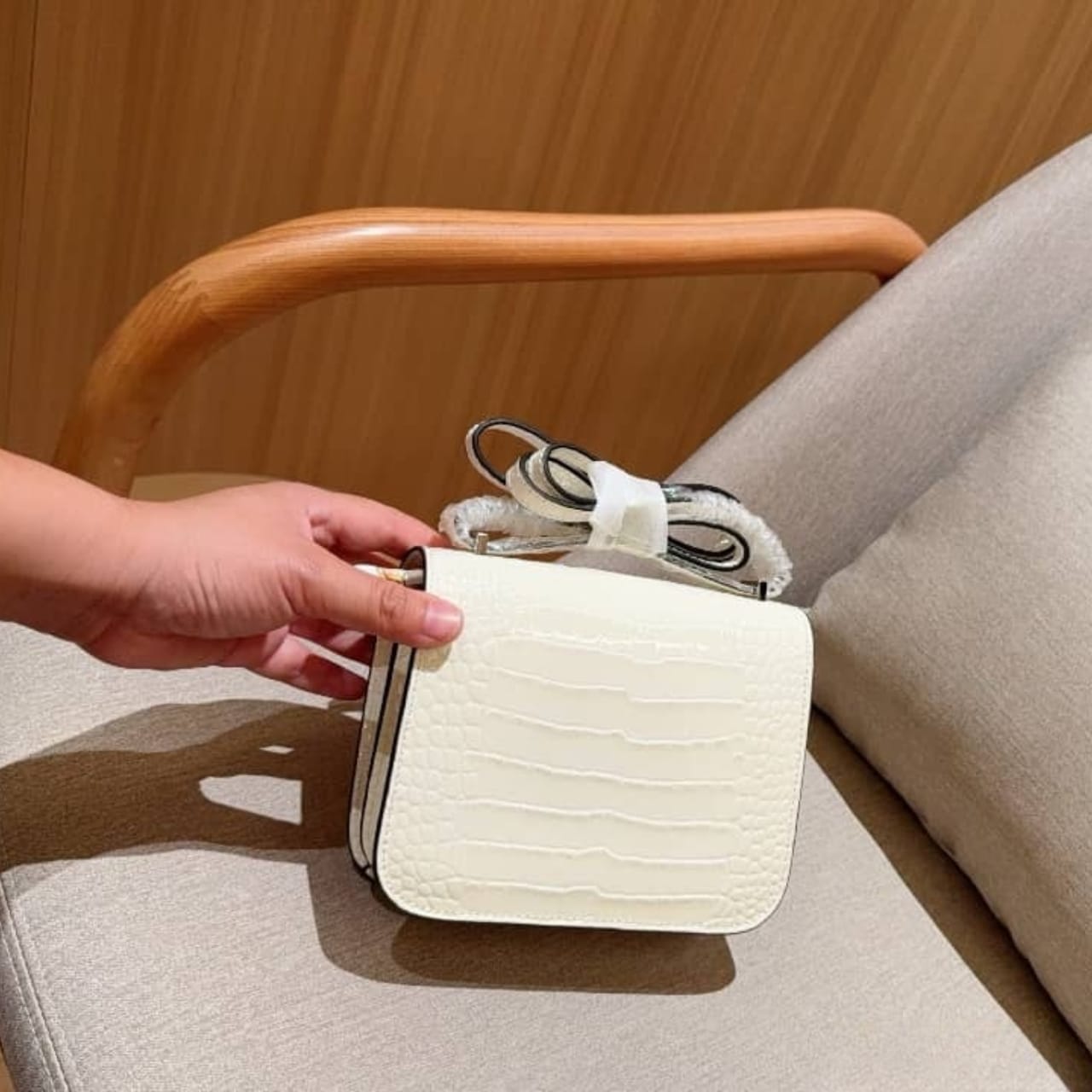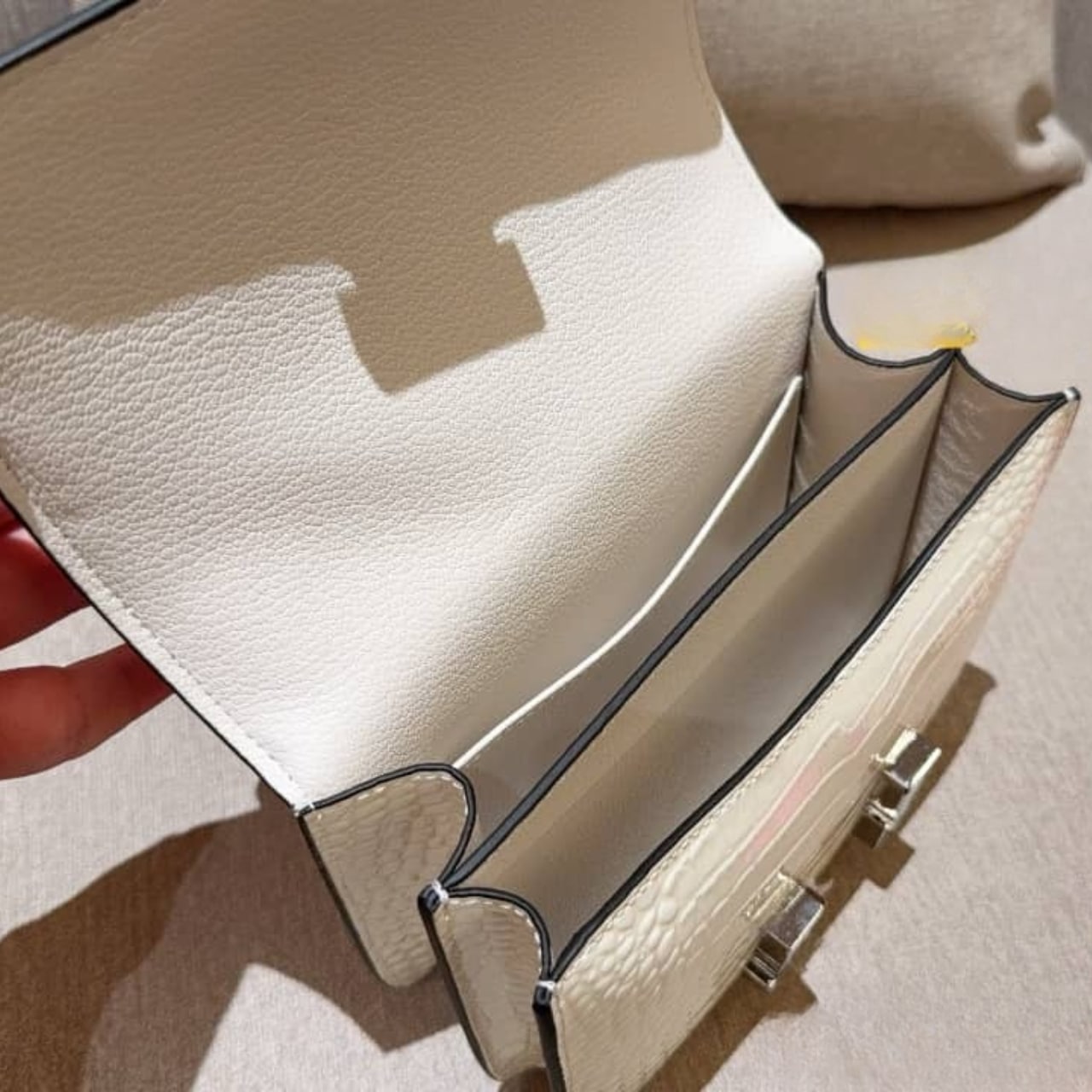 The Hermès Constance 19 in shiny white is a symbol of timeless sophistication and modern elegance. Featuring the iconic “H” clasp in polished hardware. Its compact size and sleek silhouette make it a perfect choice for day-to-night refinement.