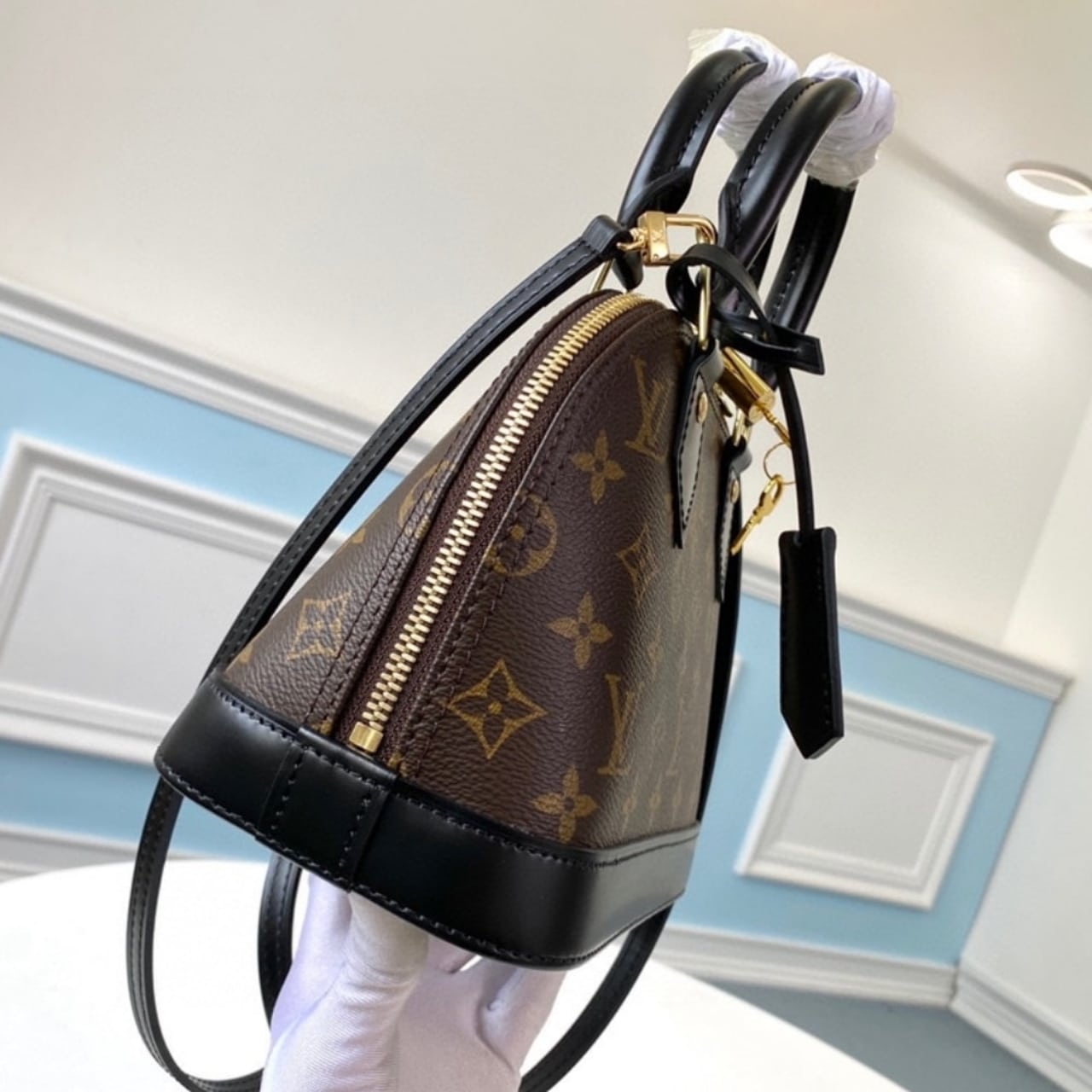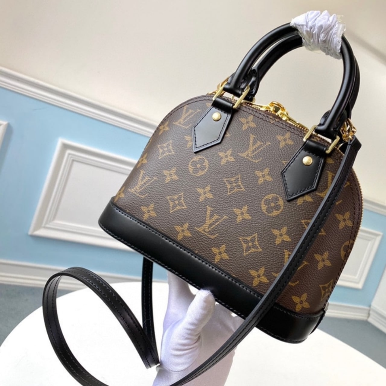 This is a Louis Vuitton Alma BB handbag in Monogram canvas. It features the brand’s signature monogram pattern with black leather trim, top handles, and a detachable shoulder strap for versatile carry. The structured silhouette and gold-tone hardware make it a timeless and elegant piece.