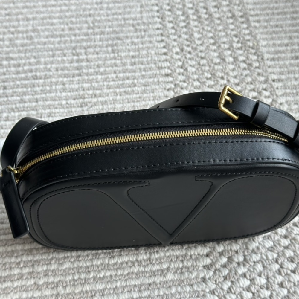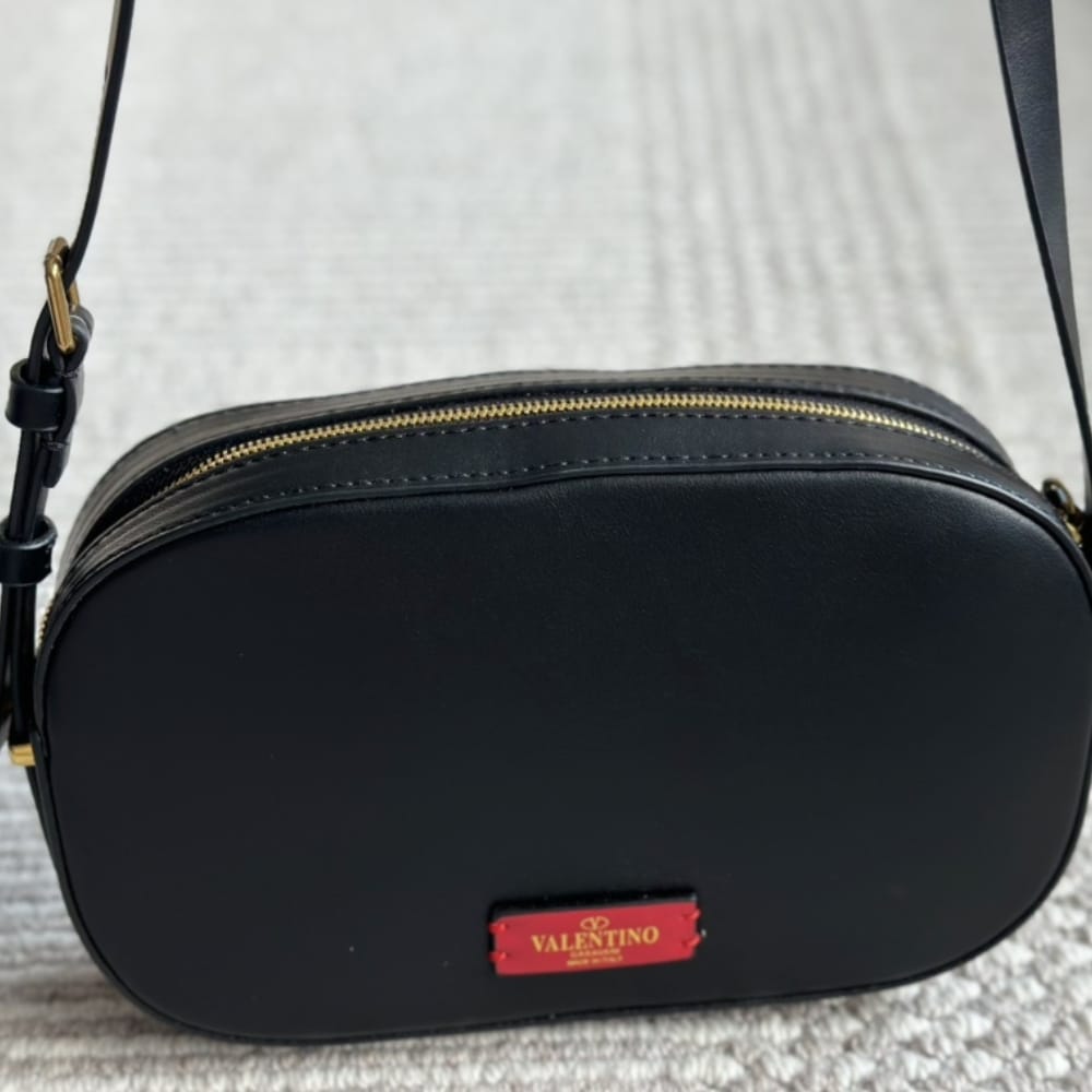 The Valentino VLogo Walk crossbody bag in black Leather features antique-brass-finish hardware and a sleek zip closure. It comes with an adjustable strap, suede leather lining, and a flat interior pocket for added functionality. Perfect for effortless elegance.